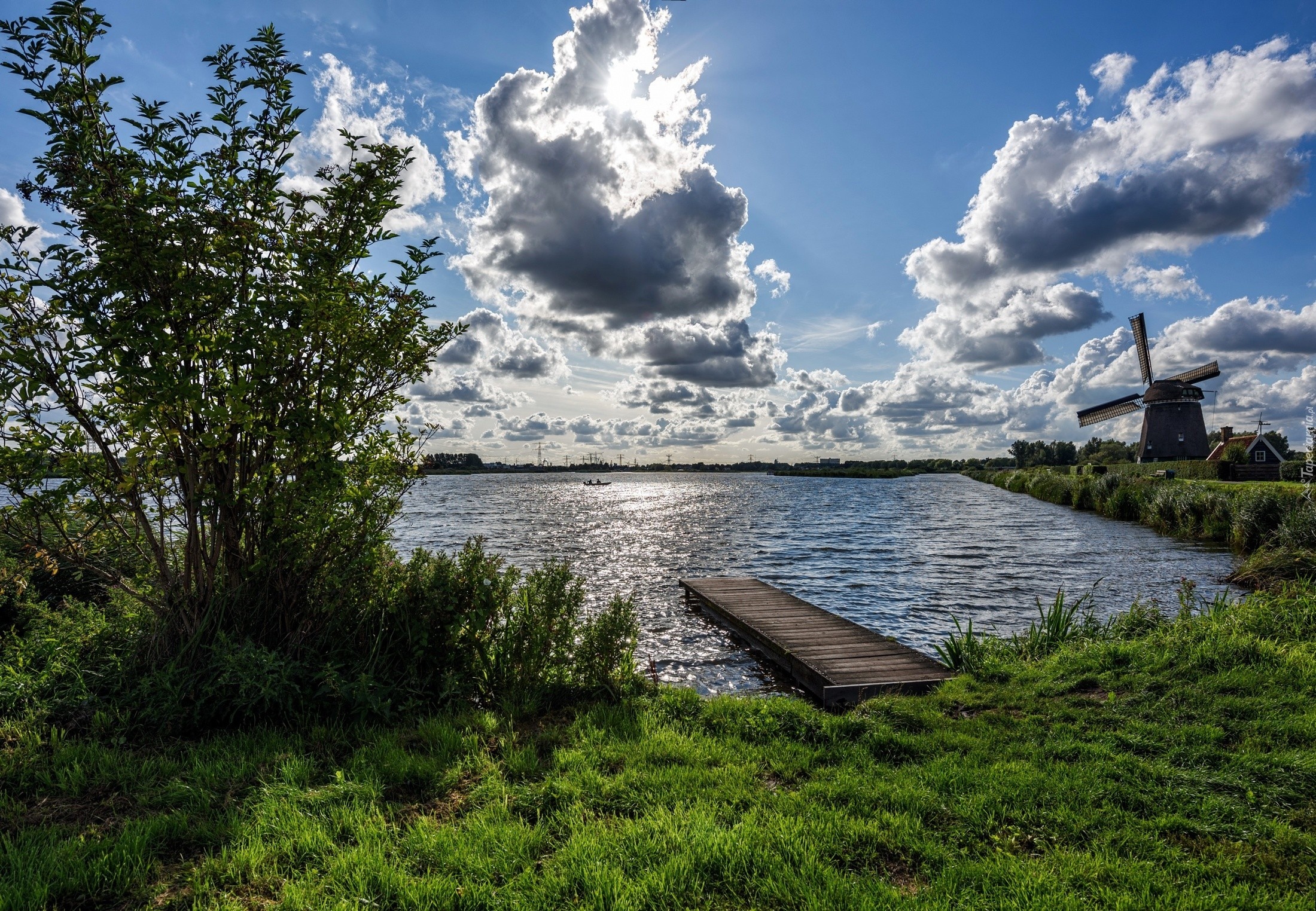 Edytor tapety: Jezioro, Wiatrak, Molo, Drzewa