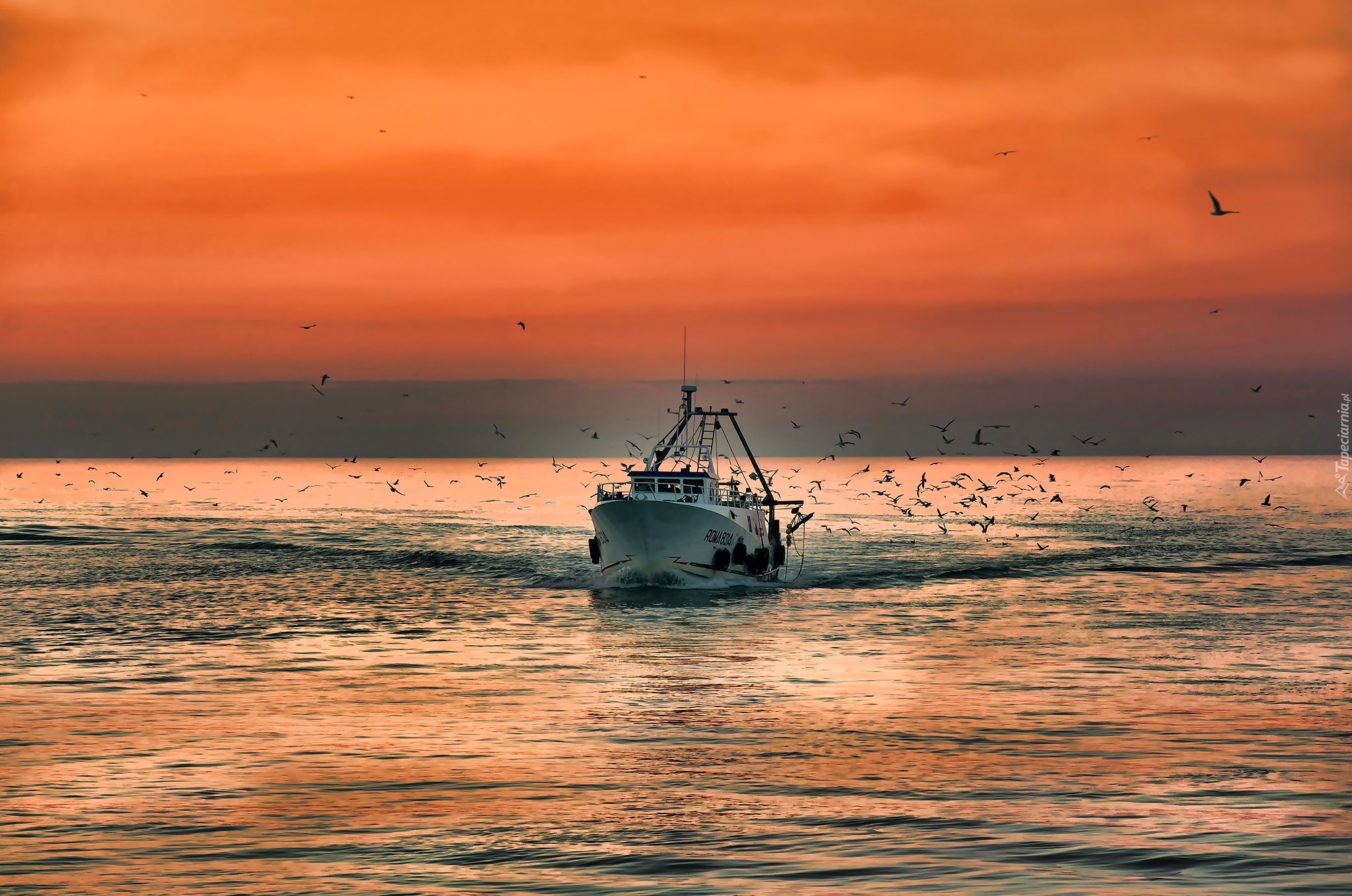 Edytor tapety: Morze, Zachód, Słońca, Statek, Ptaki
