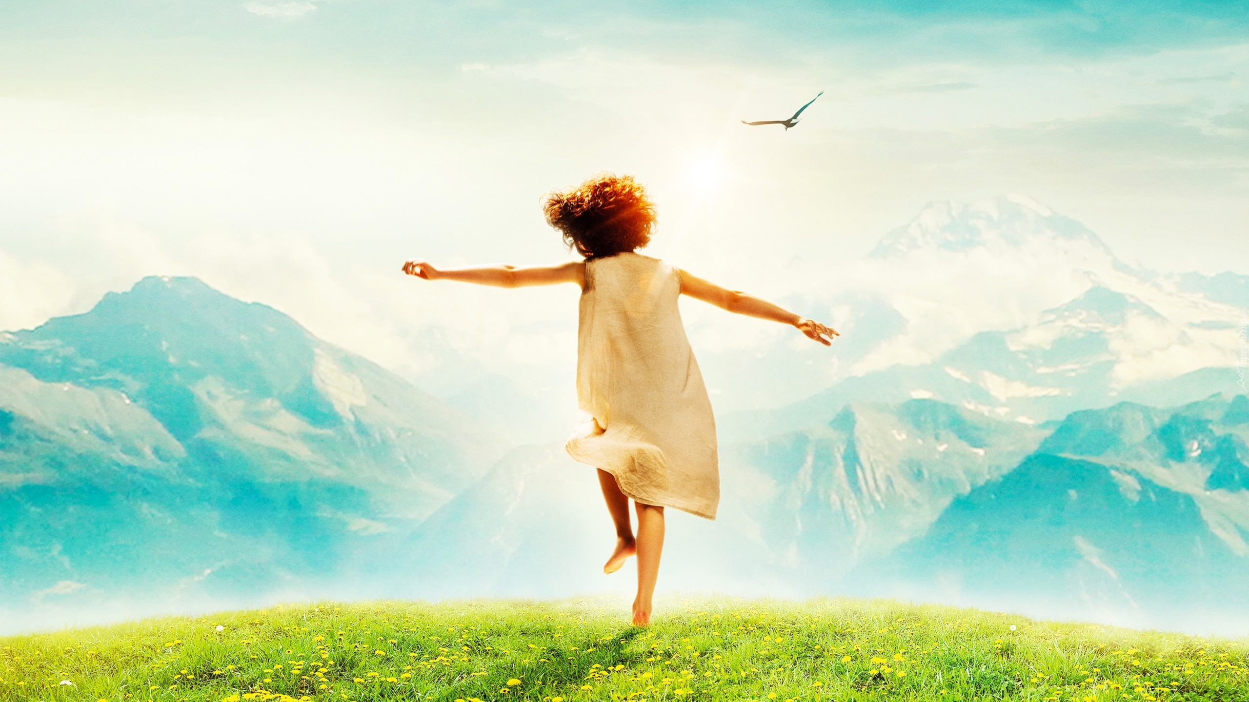 Edytor tapety: Kobieta, Ptak, Góry, Łąka