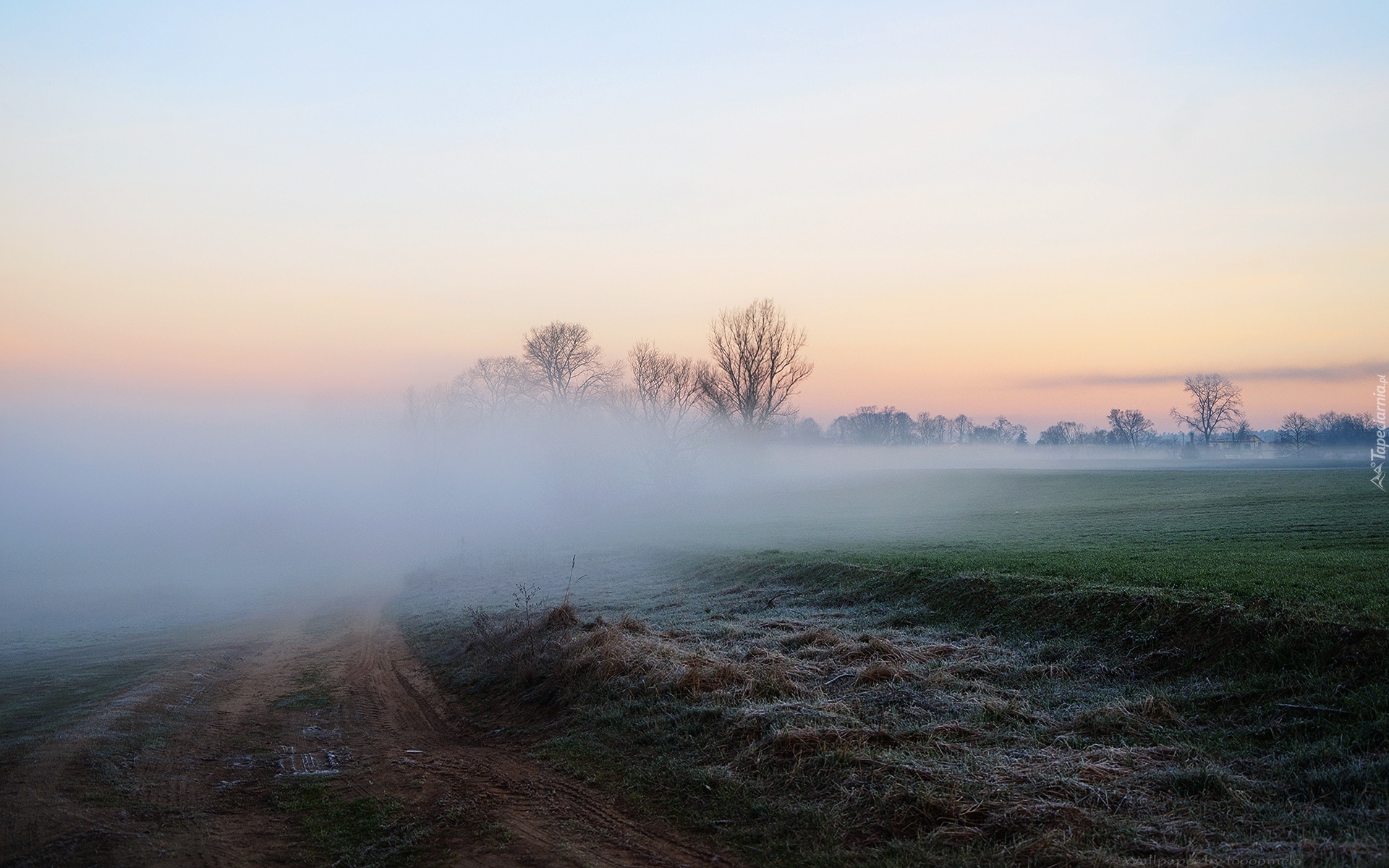 Edytor tapety: Mgła, Droga, Drzewa, Poranek.