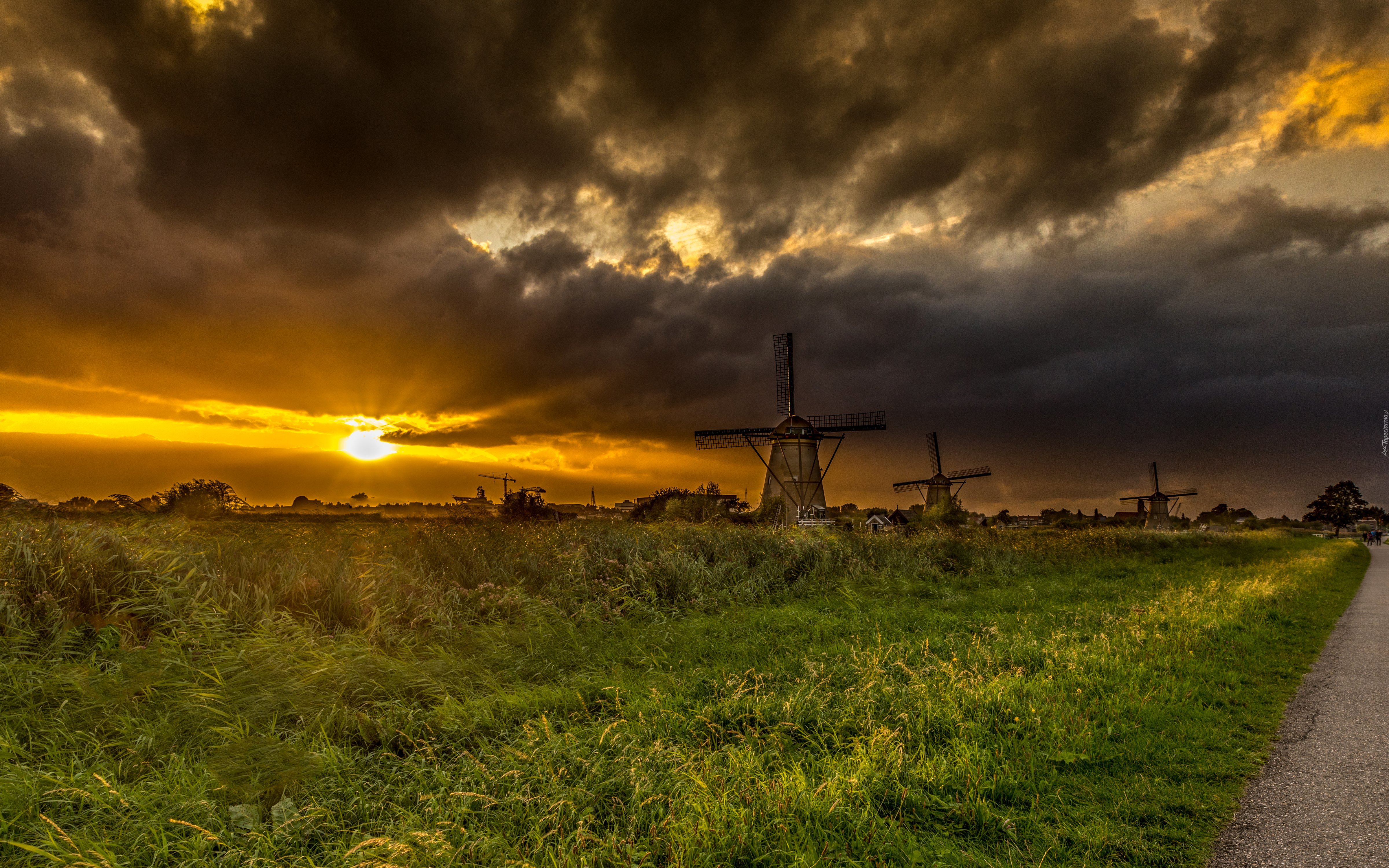 Edytor tapety: Zachód słońca, Chmury, Pole, Wiatraki