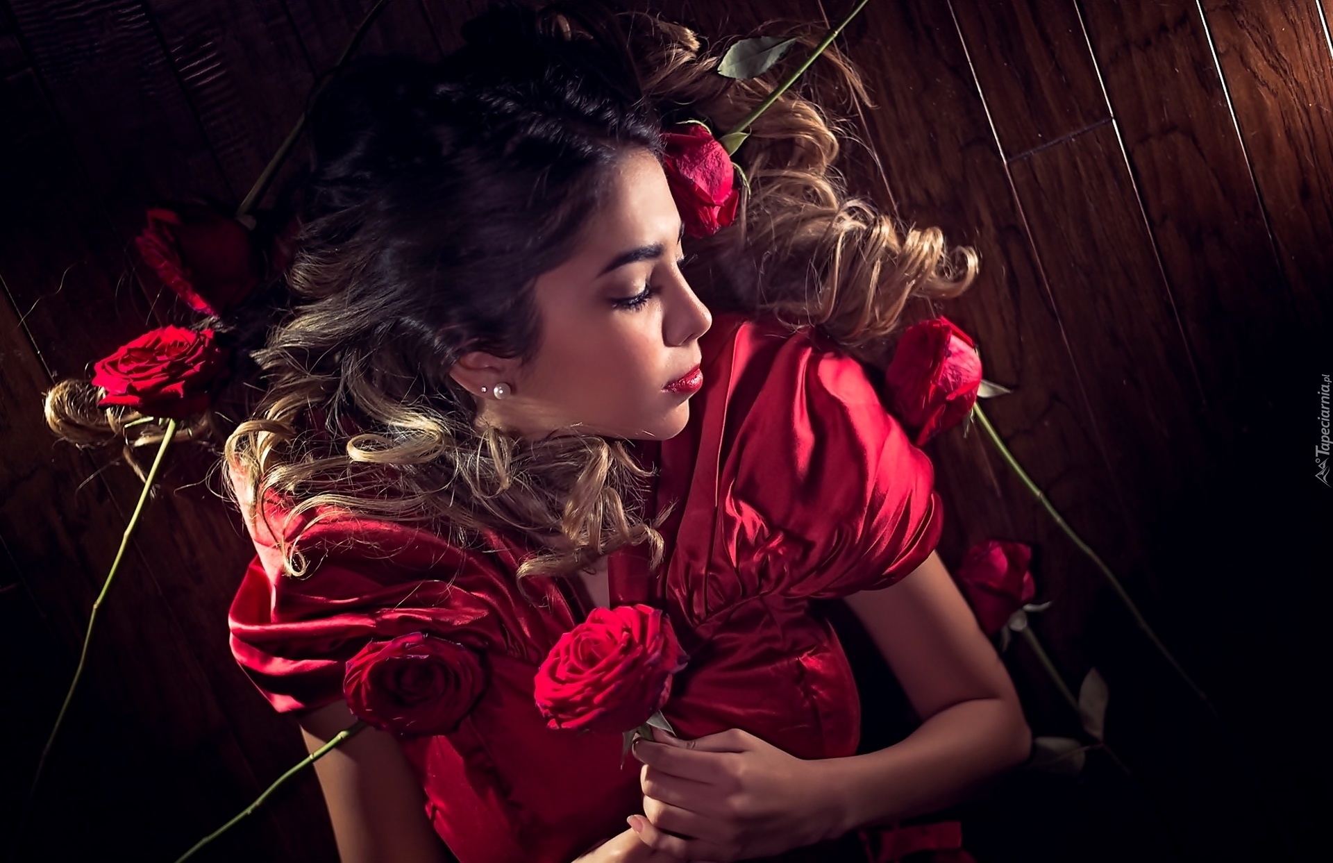 Edytor tapety: Kobieta, Czerwona, Sukienka, Czerwone, Róże