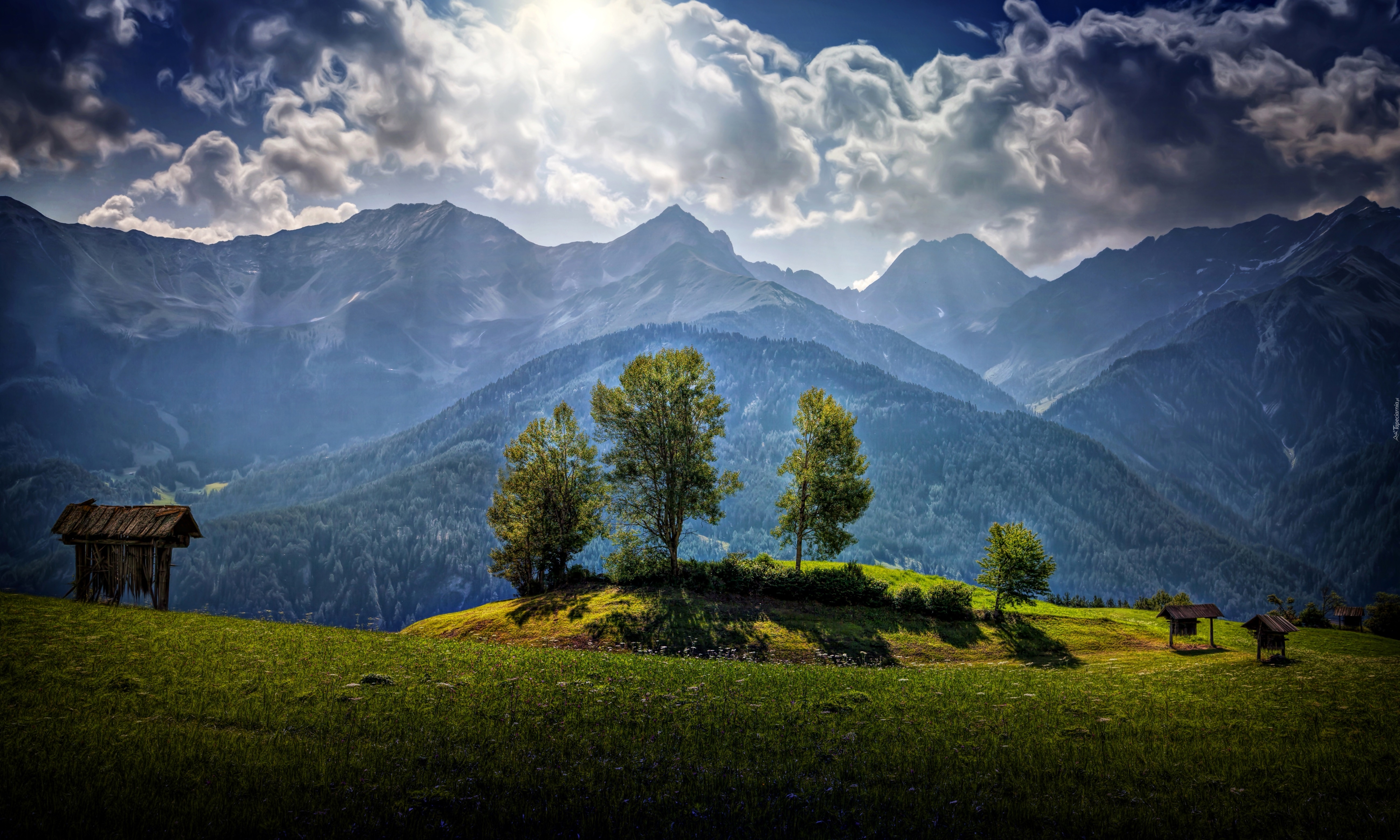 Edytor tapety: Góry, Las, Chmury, Łąka, Przebijające, Światło, Austria, HDR