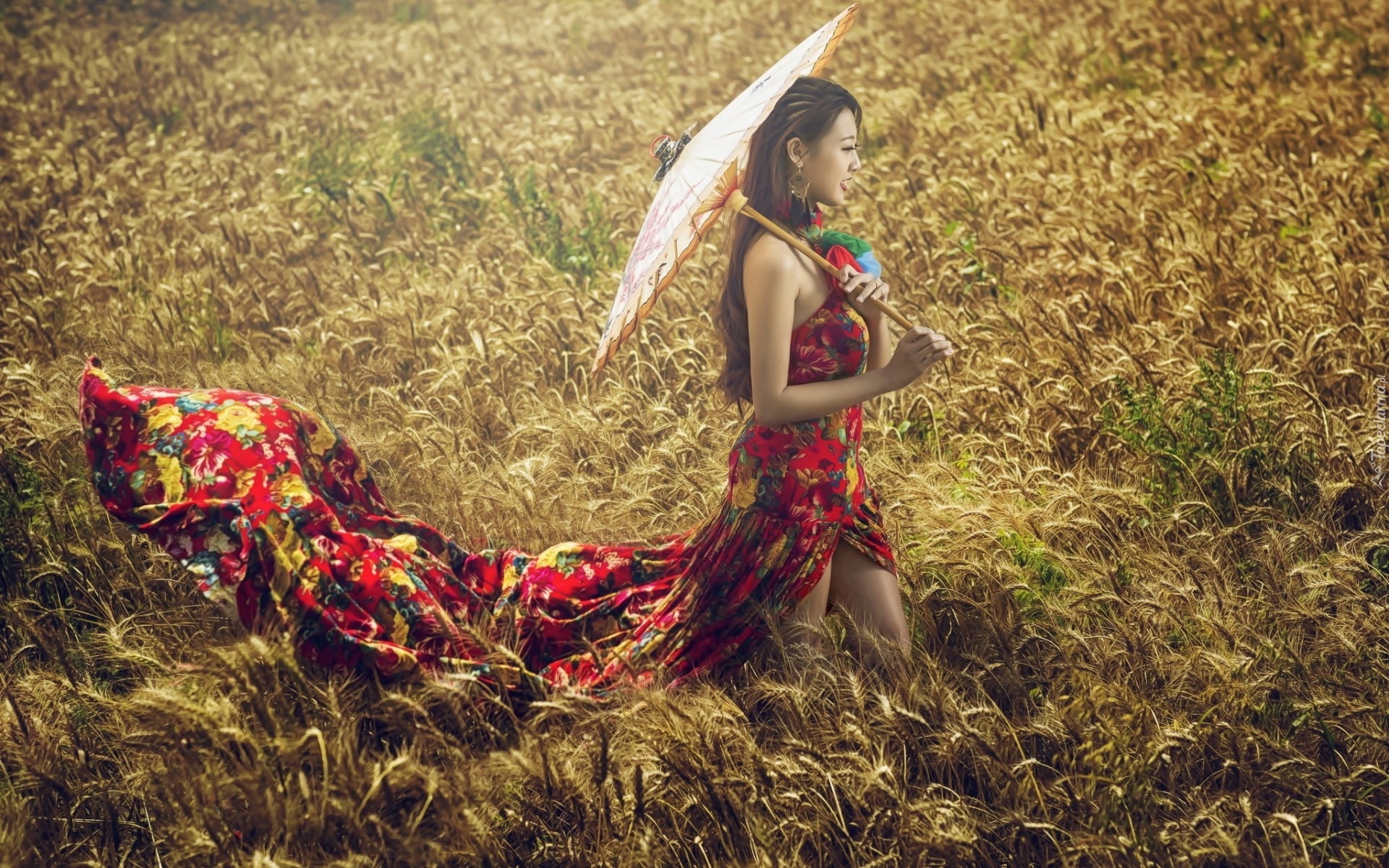 Edytor tapety: Kobieta, Azjatka, Parasol, Kolorowa, Sukienka, Pole, Zboże, Lato