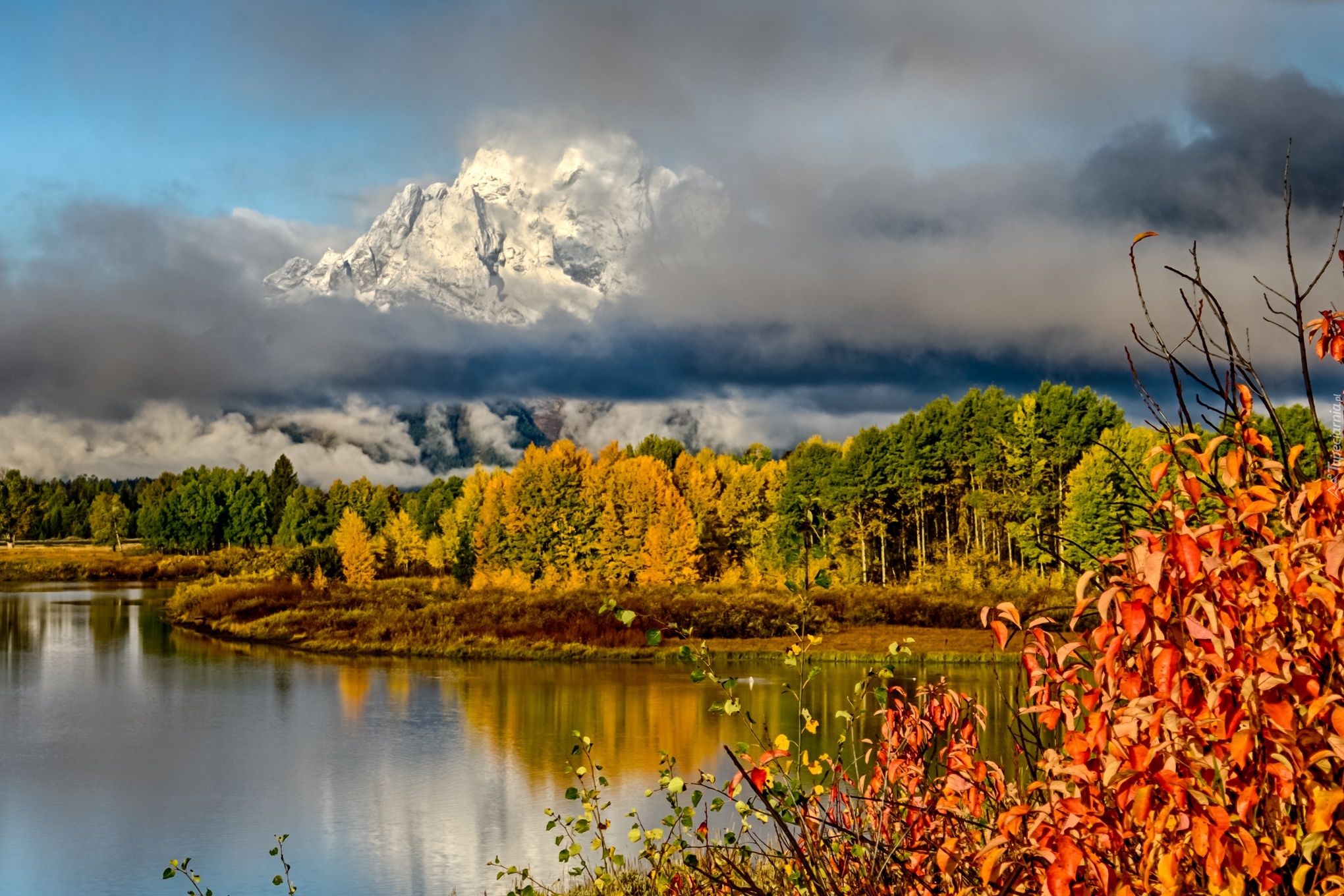 Edytor tapety: Jesień, Rzeka, Las, Góry, Chmury