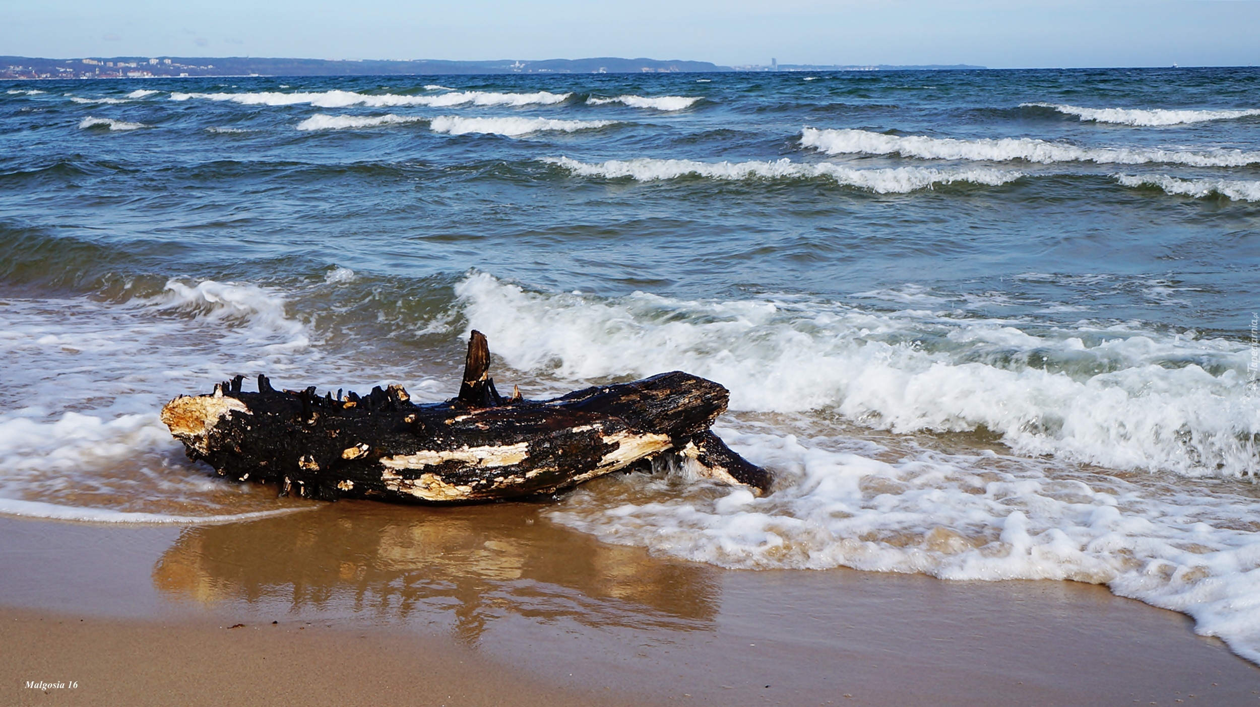 Edytor tapety: Morze, Bałtyk, Plaża, Fale, Woda, Kłoda, Piasek