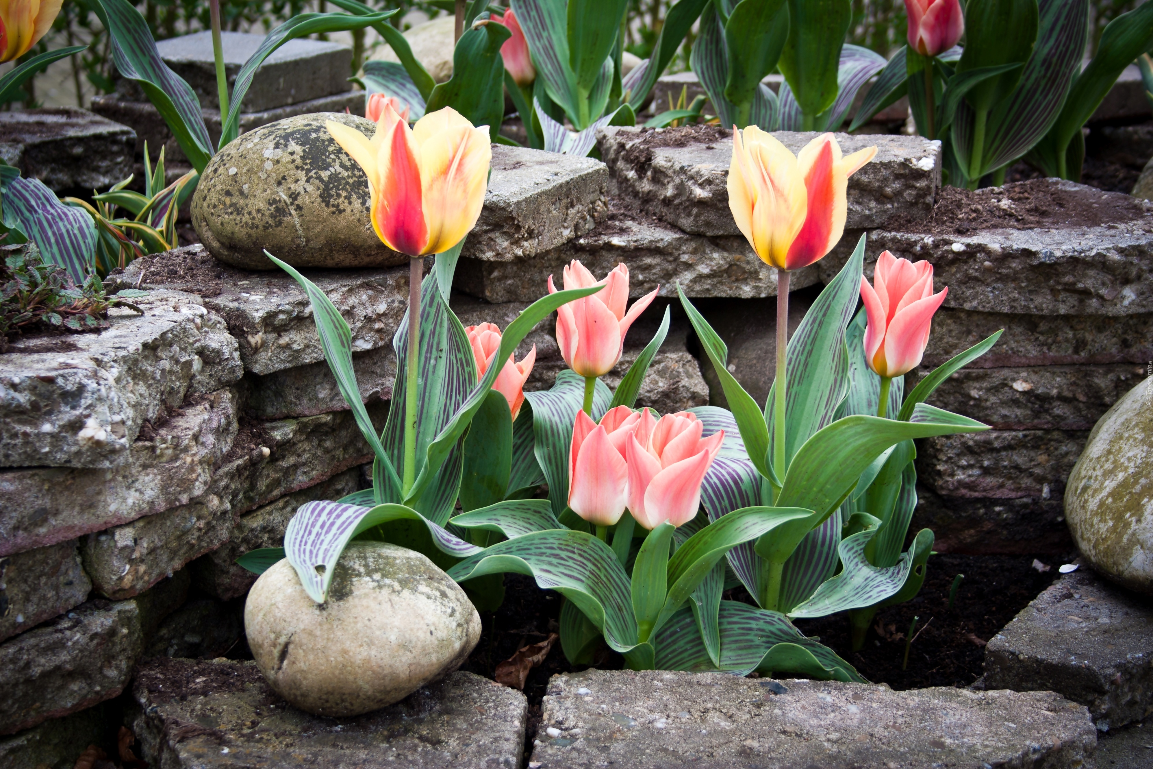 Edytor tapety: Tulipany, Ogród, Kamienie