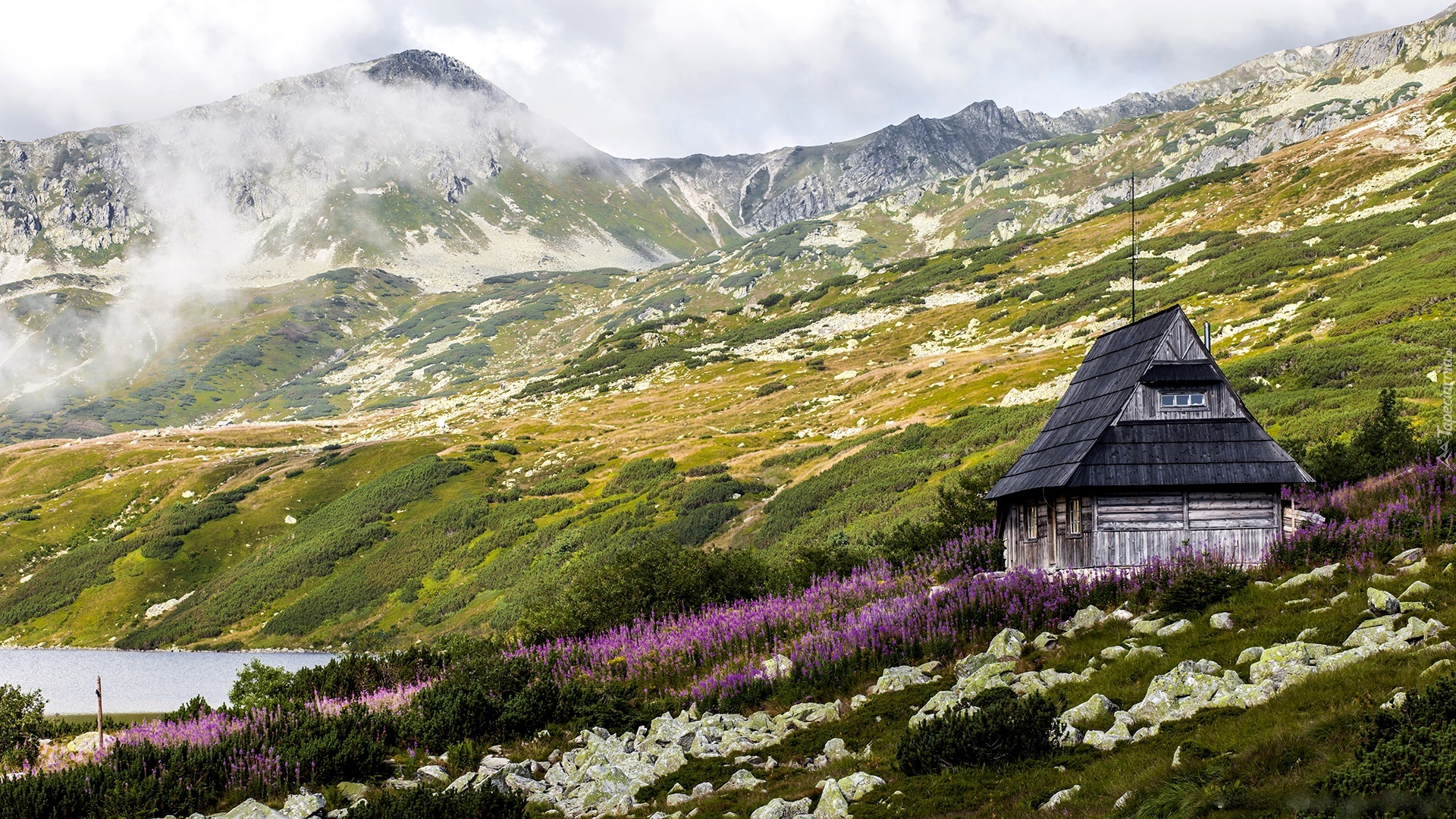 Edytor tapety: Góry, Domek, Jezioro, Mgła