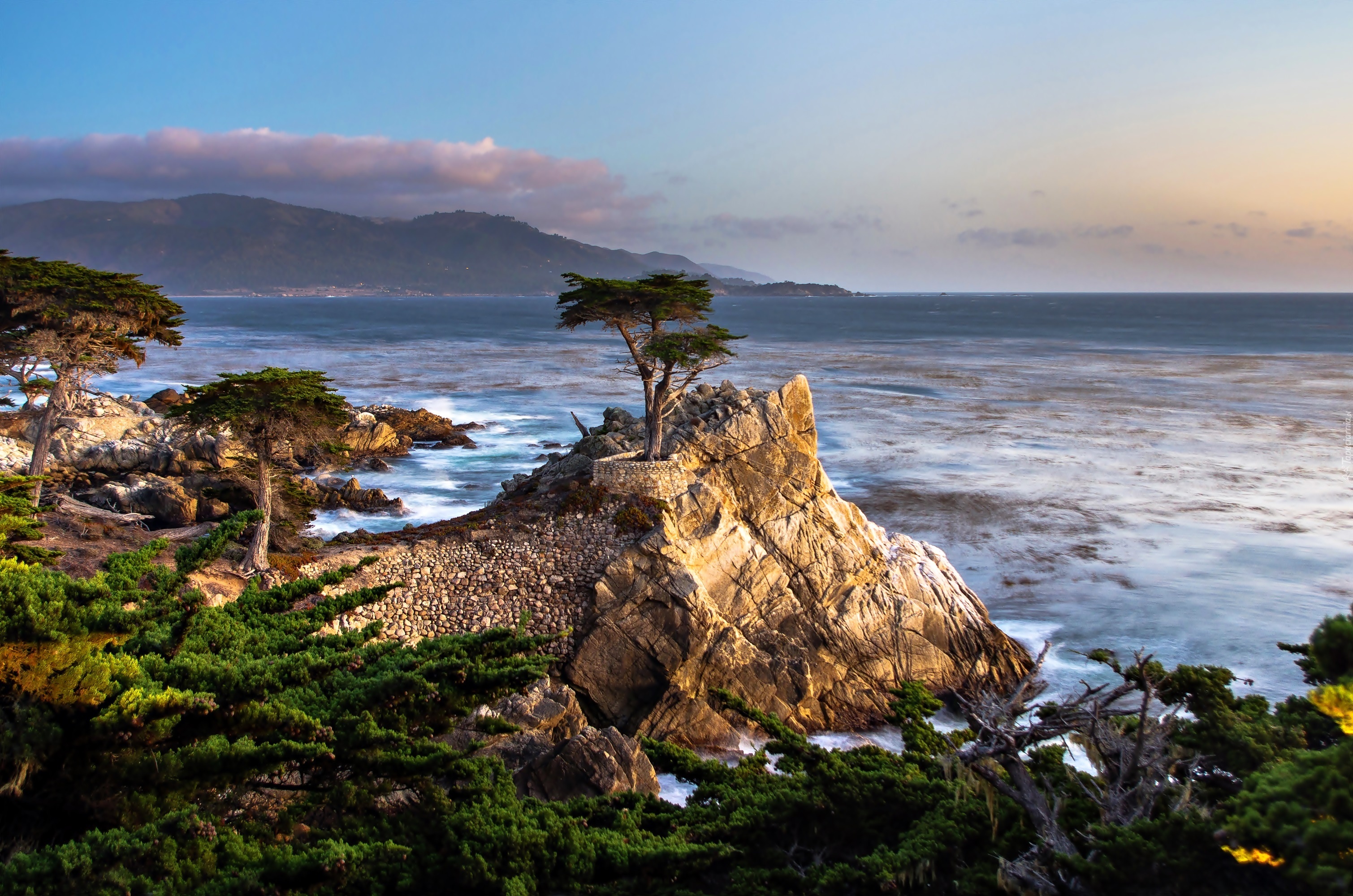 Edytor tapety: Morze, Wybrzeże, Skały, Sosny, Przebijające, Światło