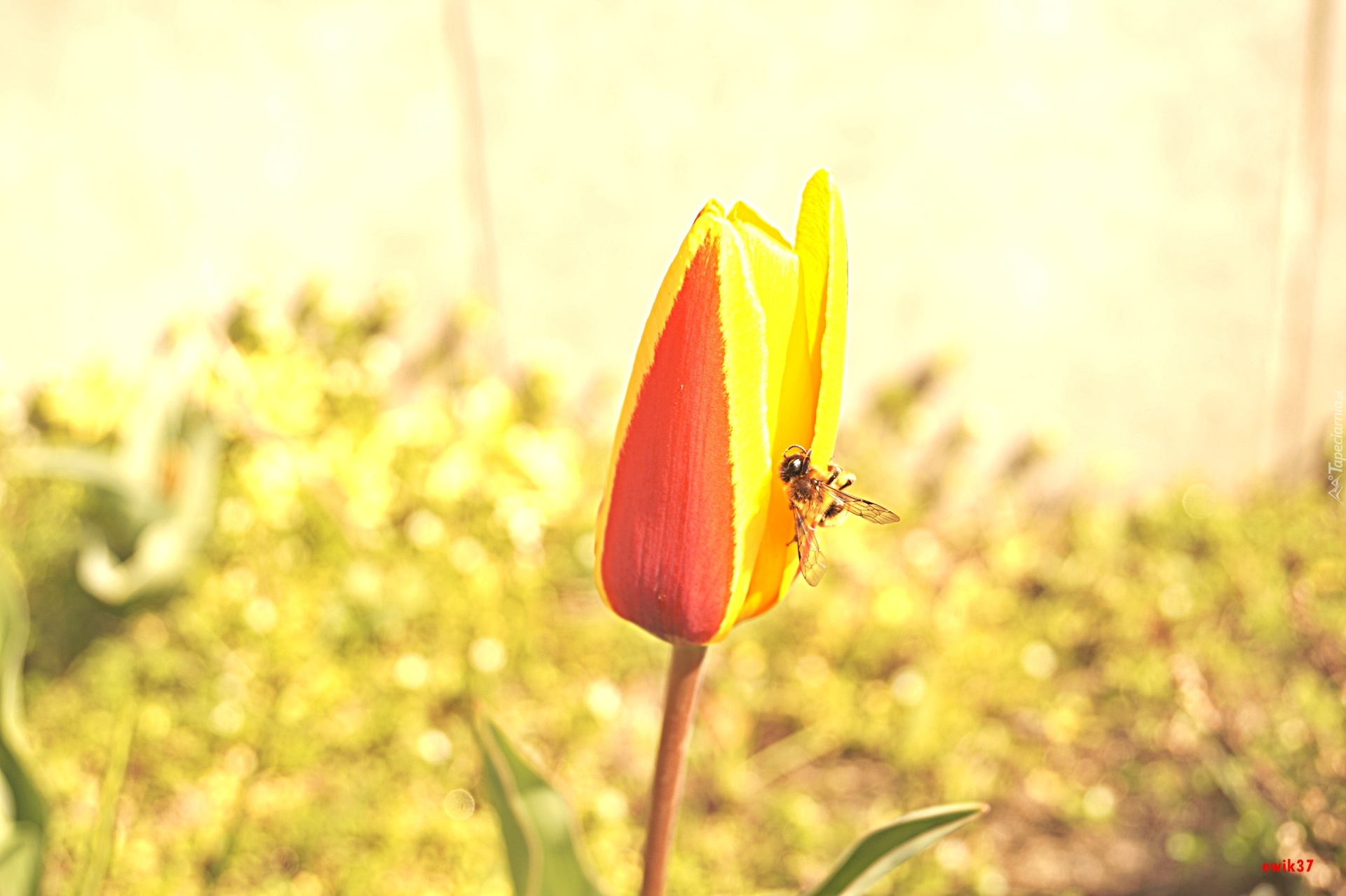 Edytor tapety: Tulipan, Żółto, Czerwony, Pszczoła