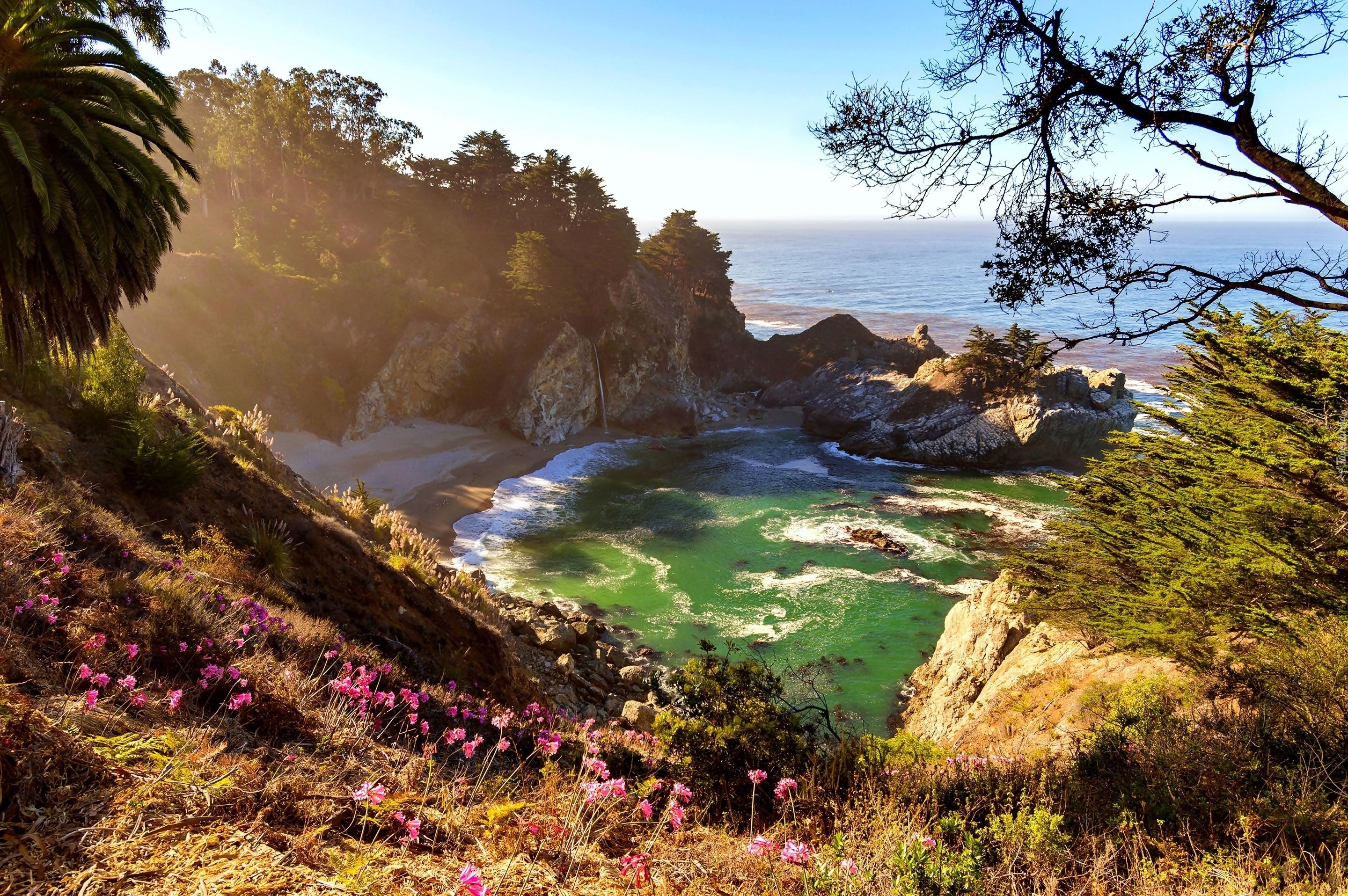 Edytor tapety: Wybrzeże, Zatoka, Skały, Morze, Kwiaty, Drzewa, Kalifornia