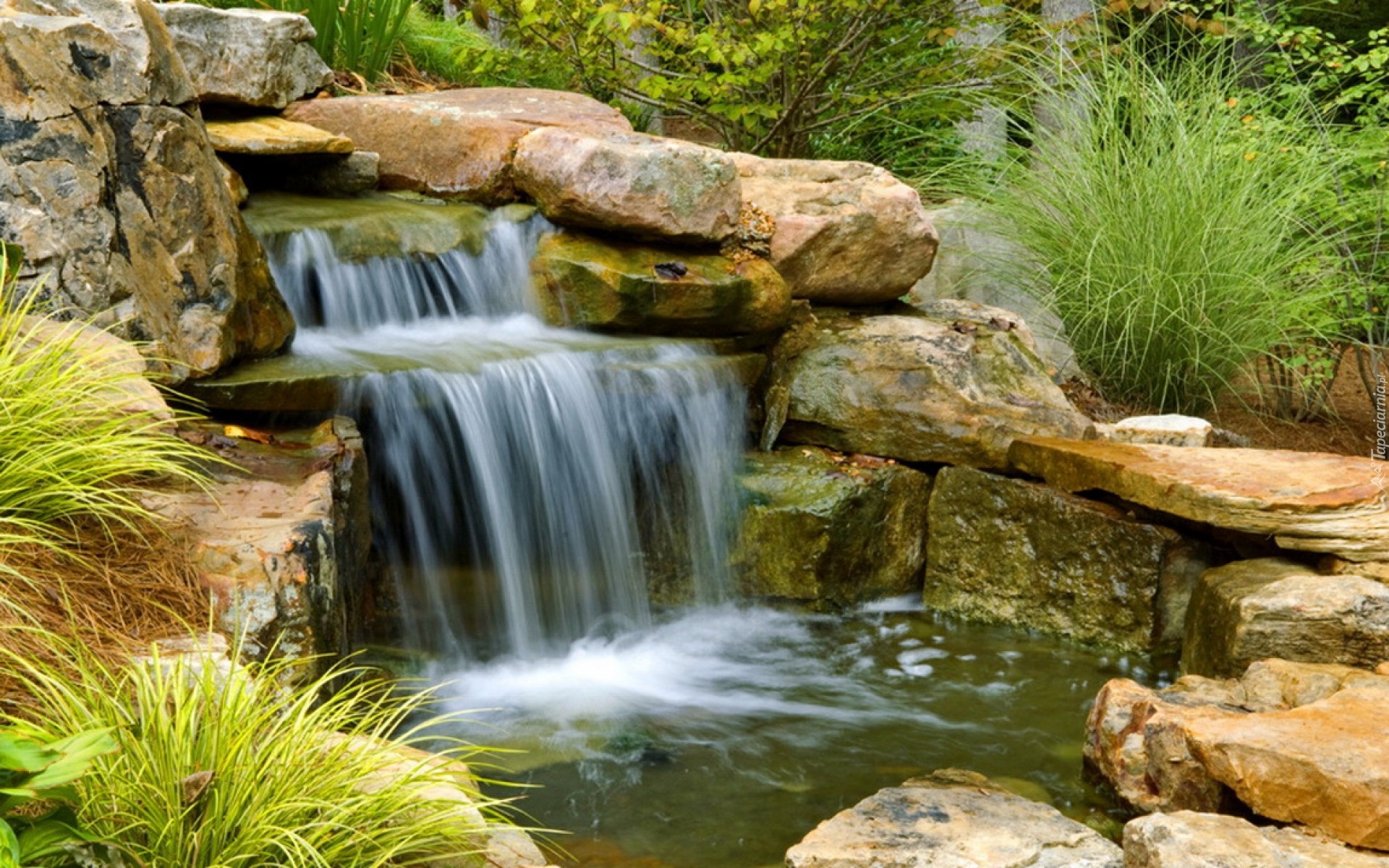 Edytor tapety: Wodospad, Kamienie, Kępy, Trawy, Krzewy