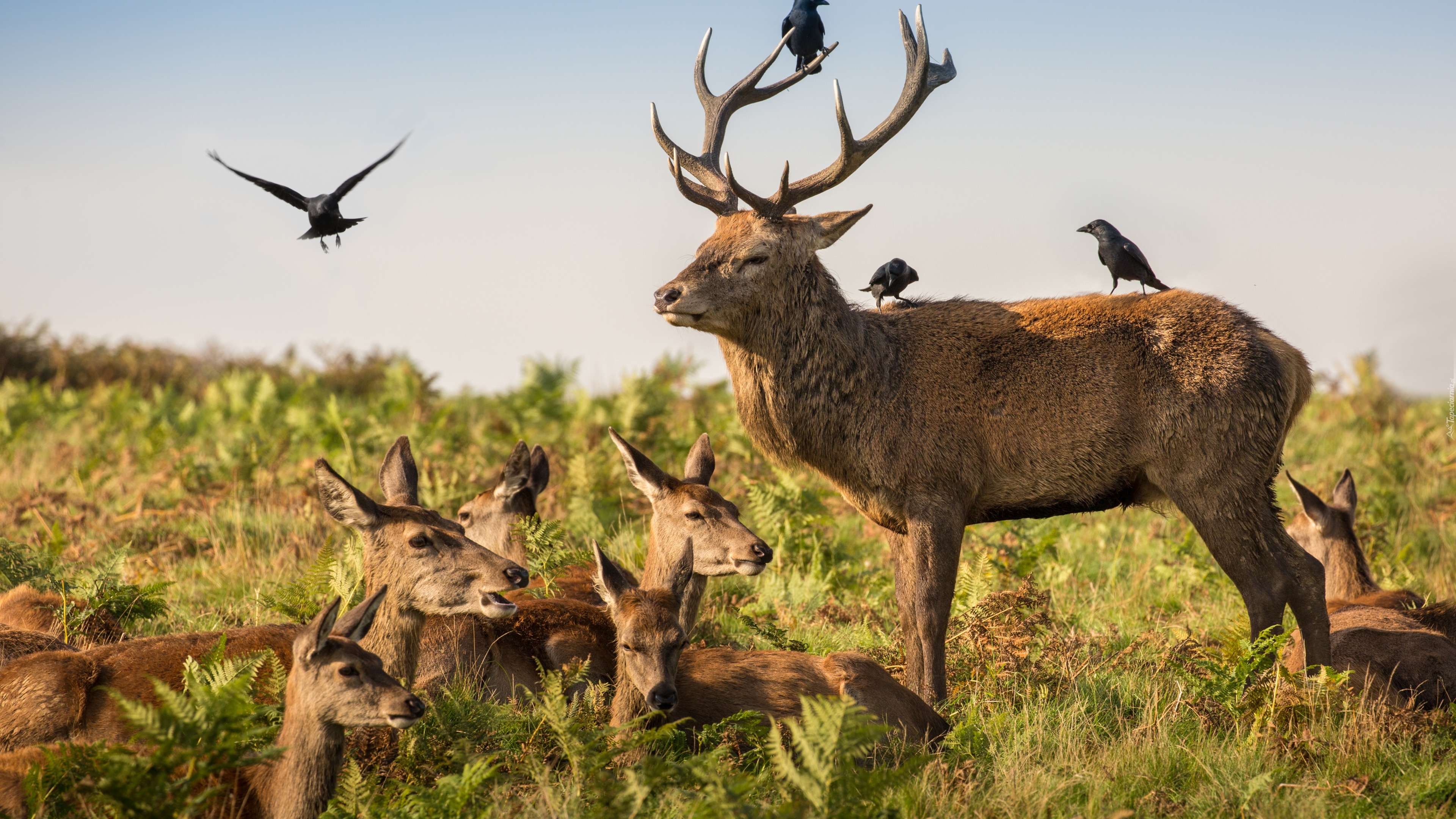 Edytor tapety: Jeleń, Ptaki, Łanie, Łąka