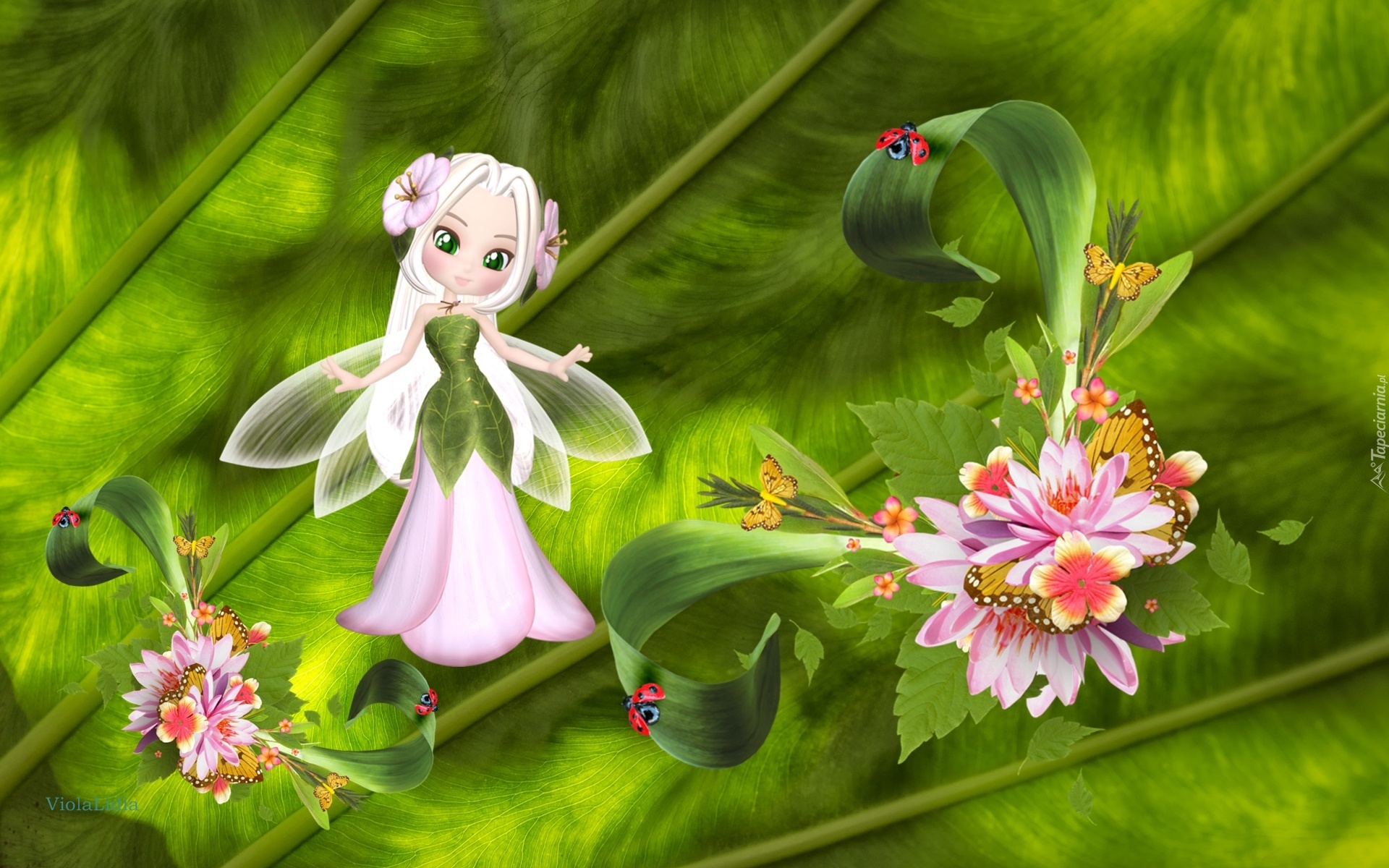 Edytor tapety: Grafika, Laleczka, Kwiaty, Liście