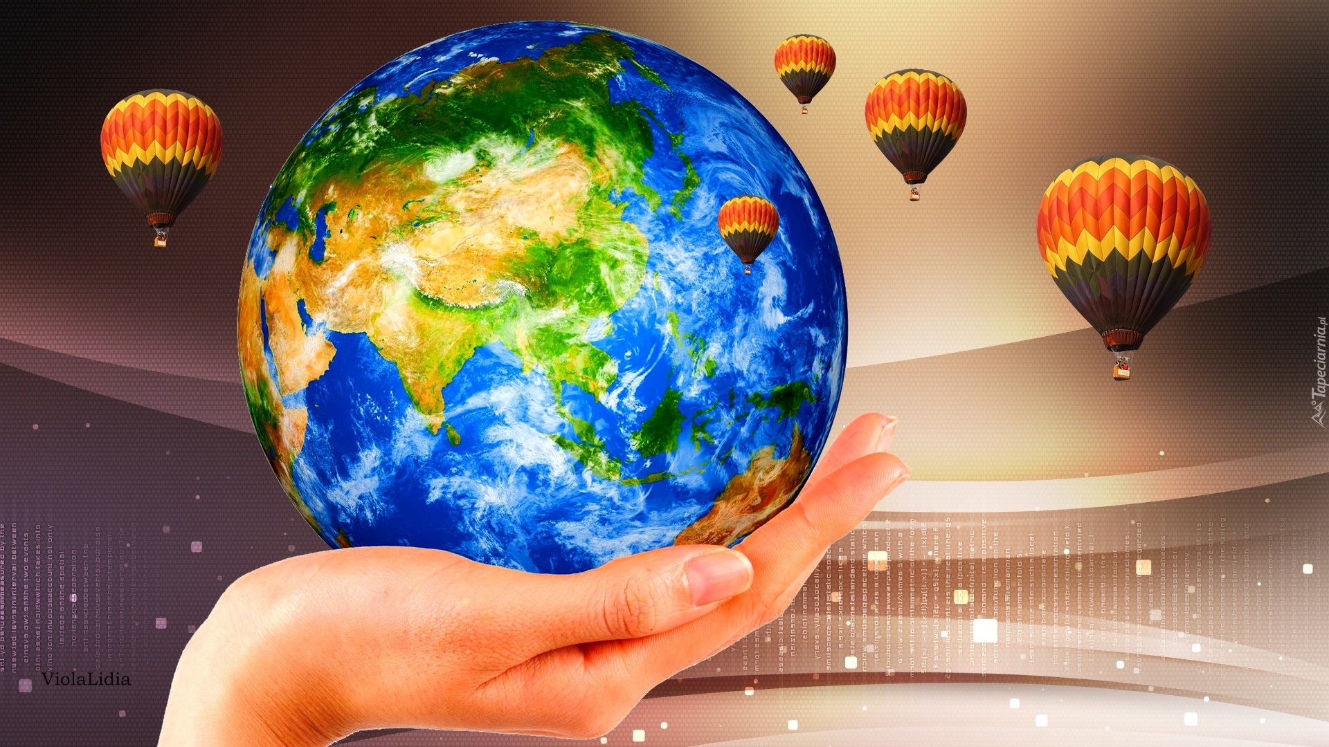 Edytor tapety: Grafika, Ręka, Planeta, Ziemia, Balony
