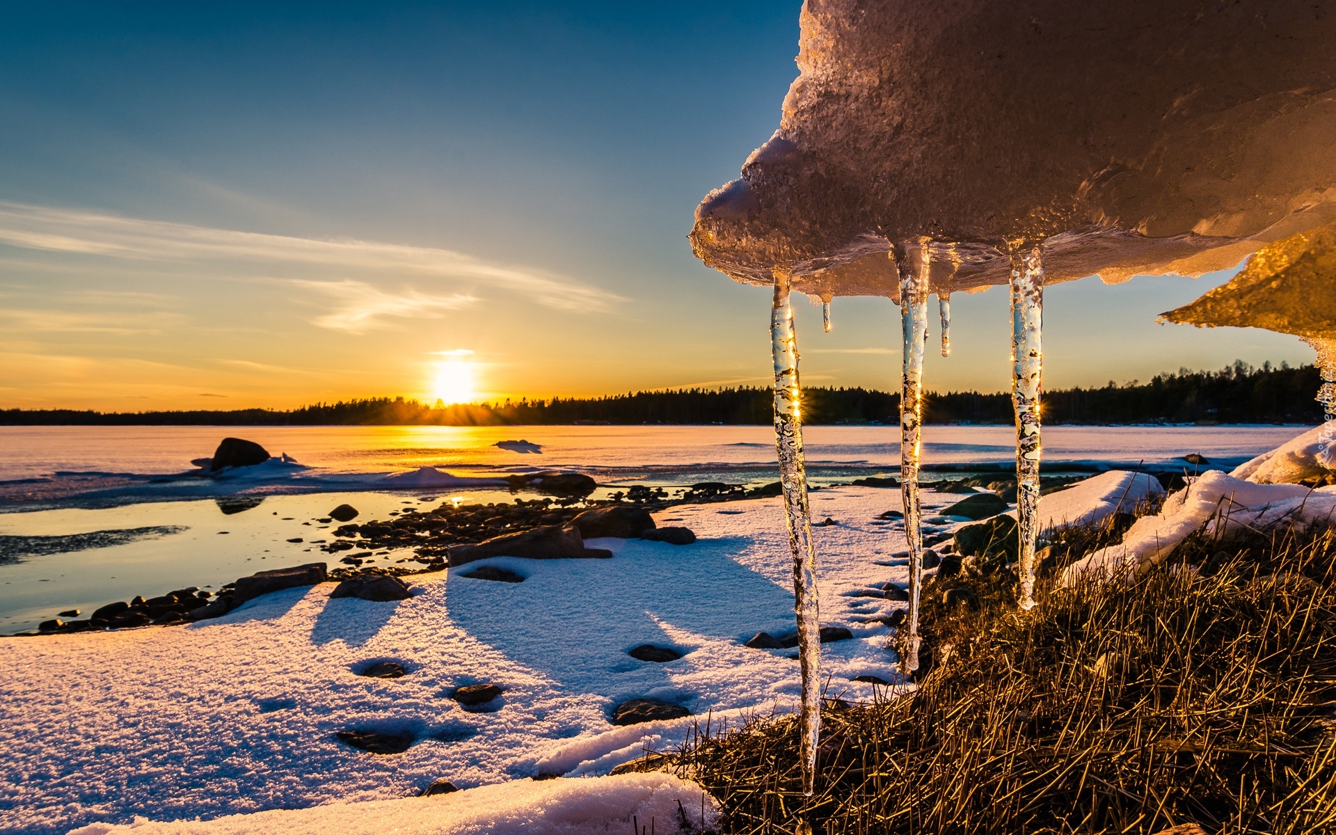 Edytor tapety: Zima, Wschód słońca, Sople, Śnieg