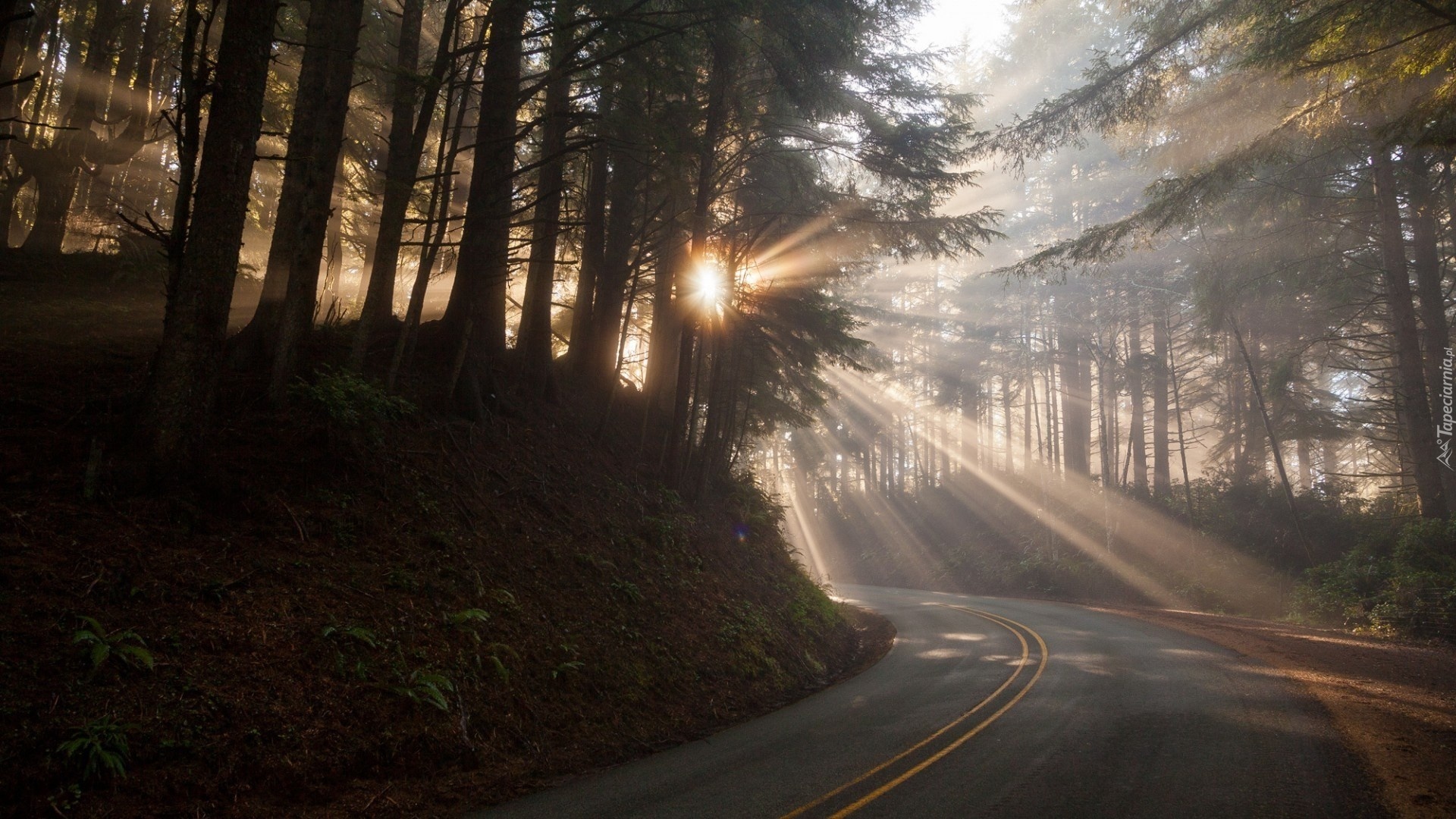 Edytor tapety: Droga, Las, Promienie, Słońca, Mgła