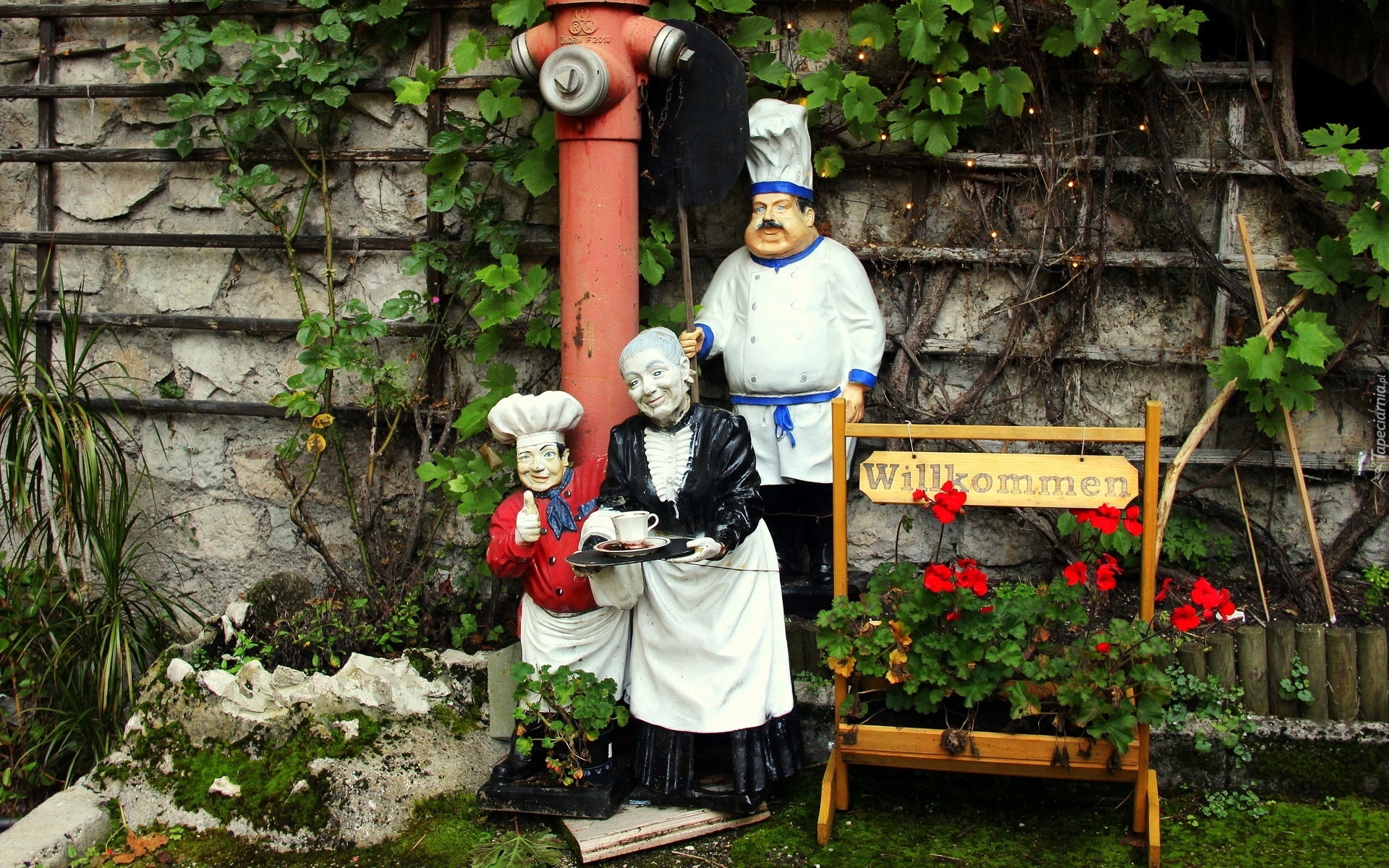 Edytor tapety: Figury, Kucharz, Gospodyni, Kwiaty, Pelargonie, Ogródek