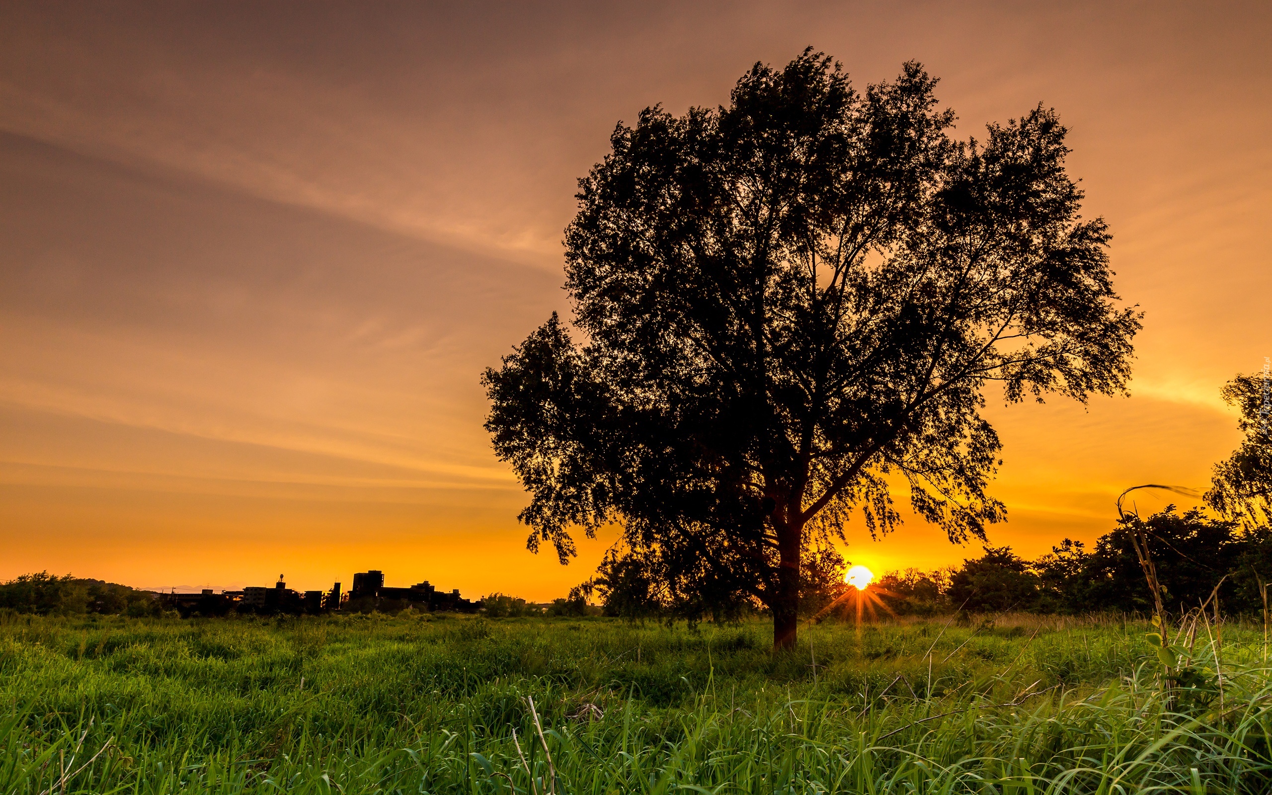 Edytor tapety: Łąka, Zachód słońca, Drzewa, Domy