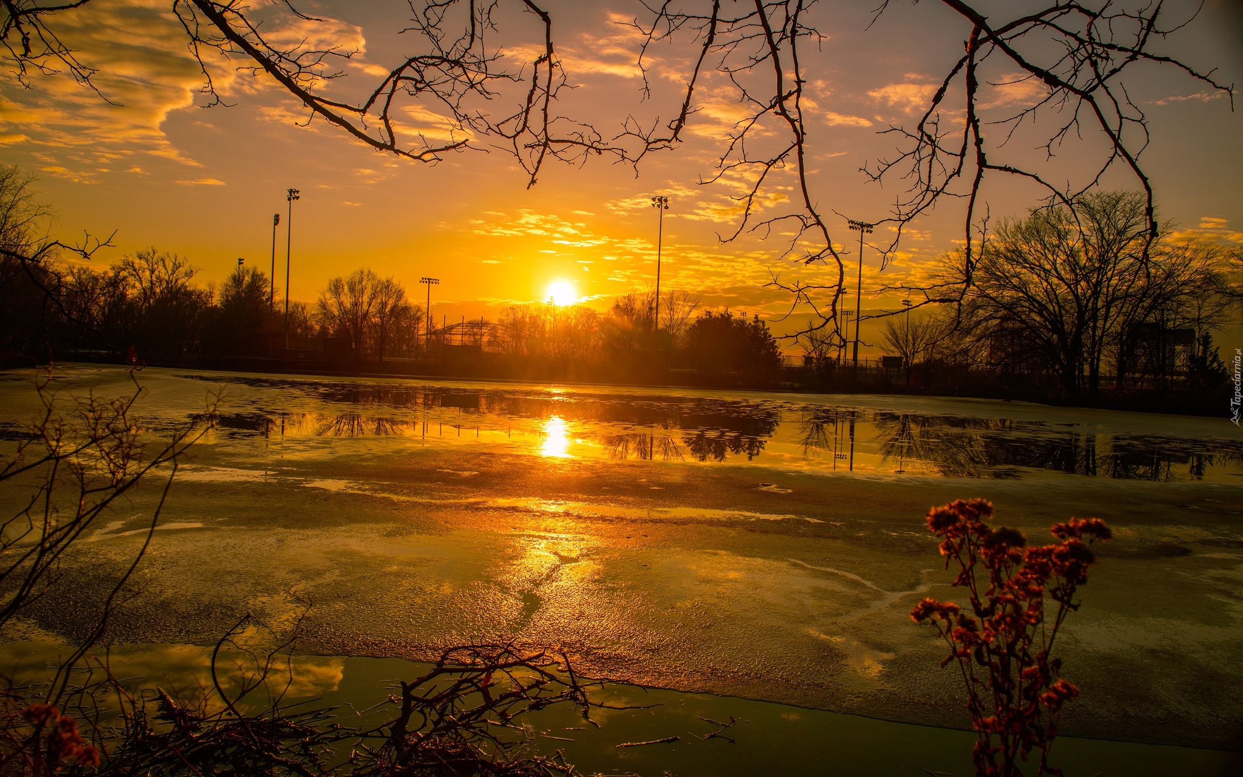 Edytor tapety: Staw, Zachód słońca, Drzewa