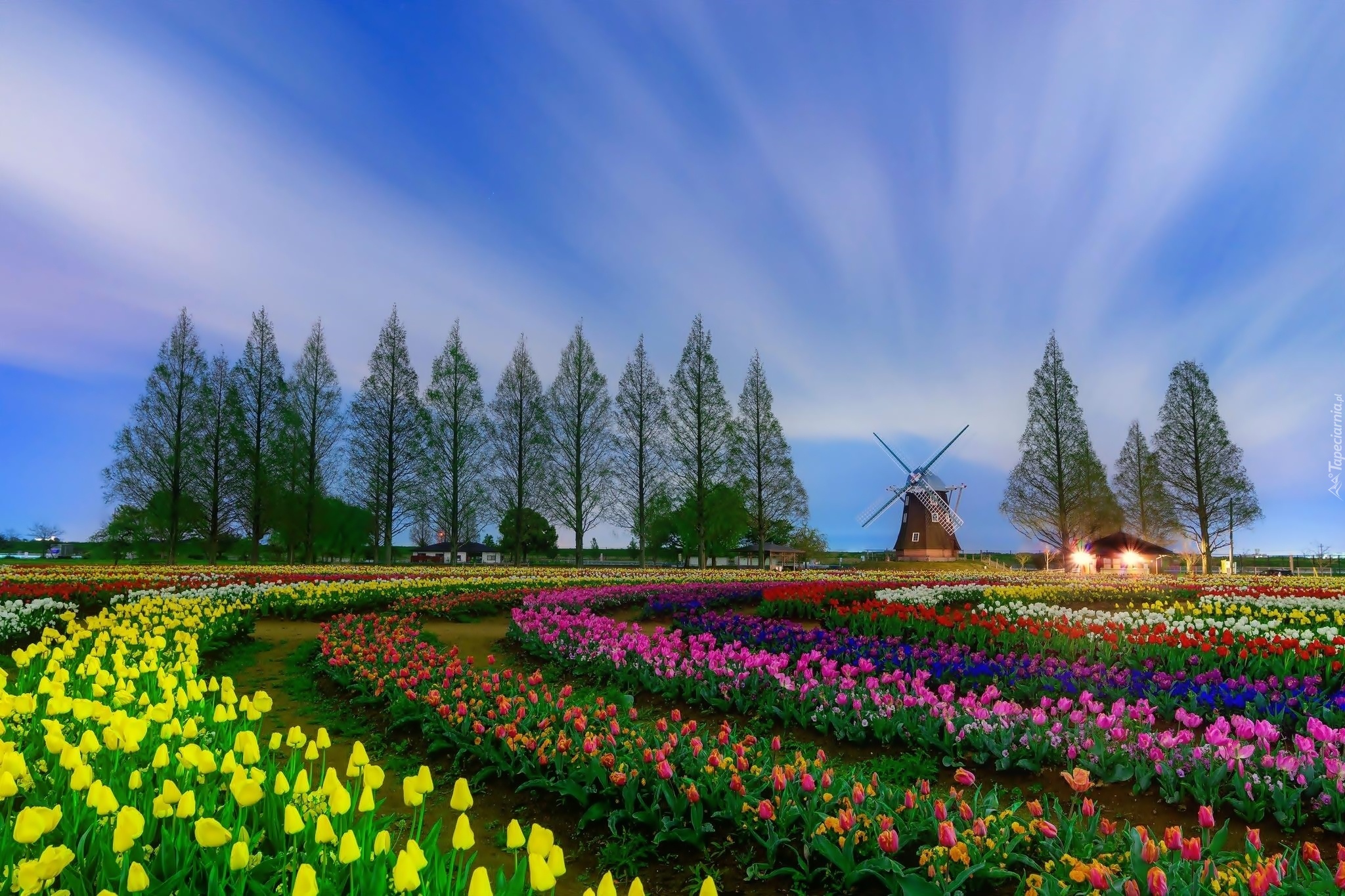 Edytor tapety: Pole, Tulipany, Domy, Wiatrak, Drzewa, Holandia