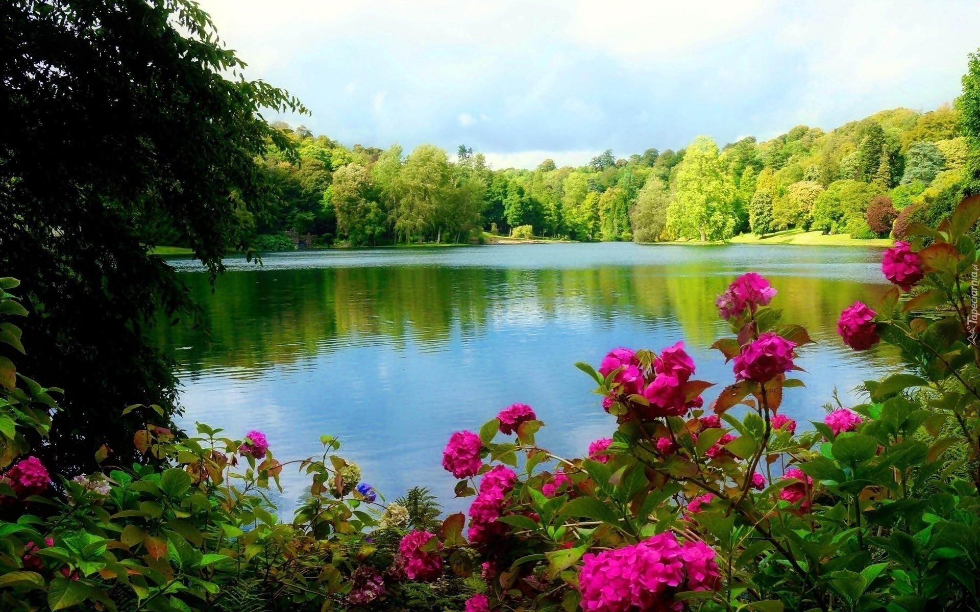 Edytor tapety: Jezioro, Drzewa, Kwiaty, Park, Wiosna