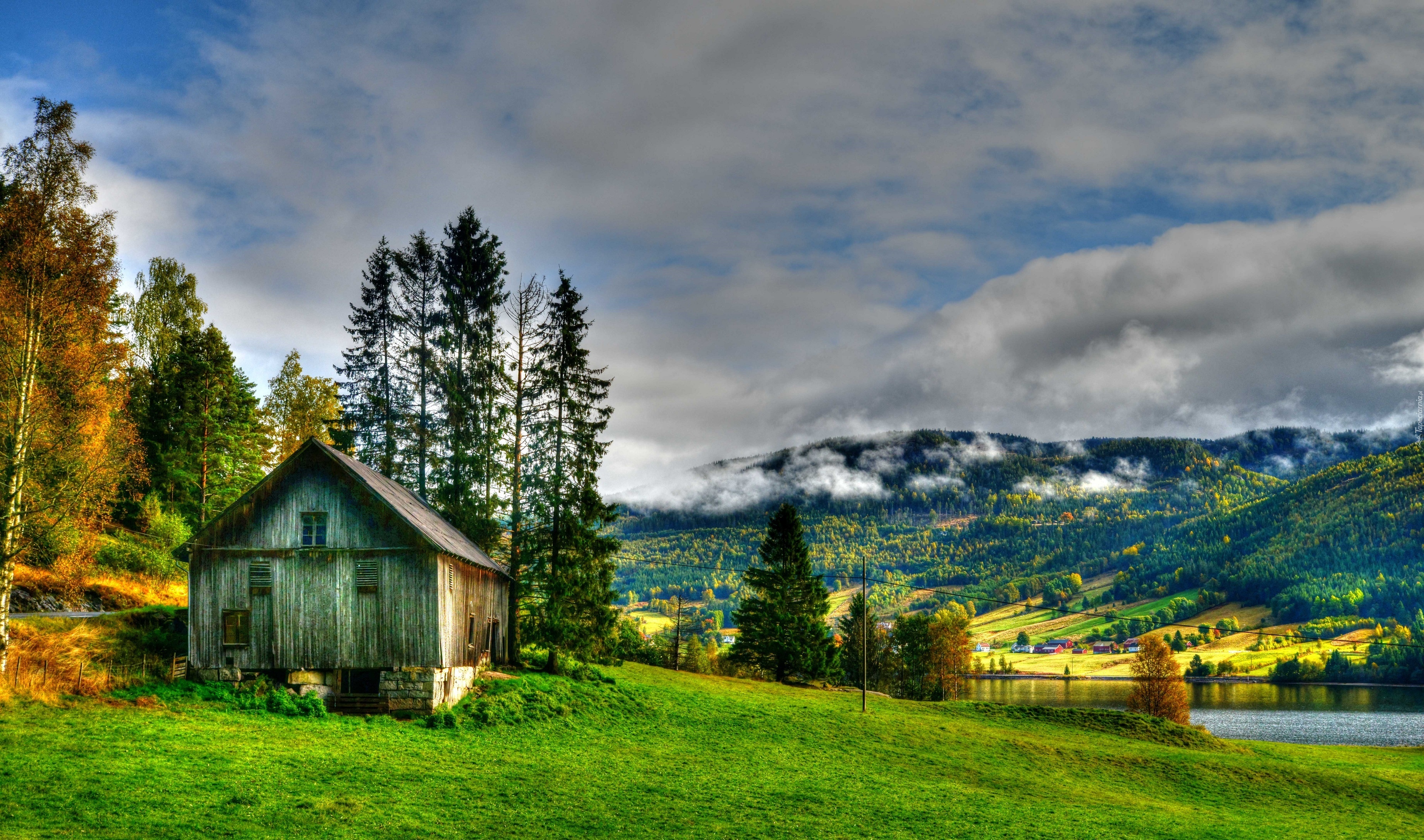 Edytor tapety: Domek, Góry, Mgła, Jeziorko, Trawa, Drzewa, HDR