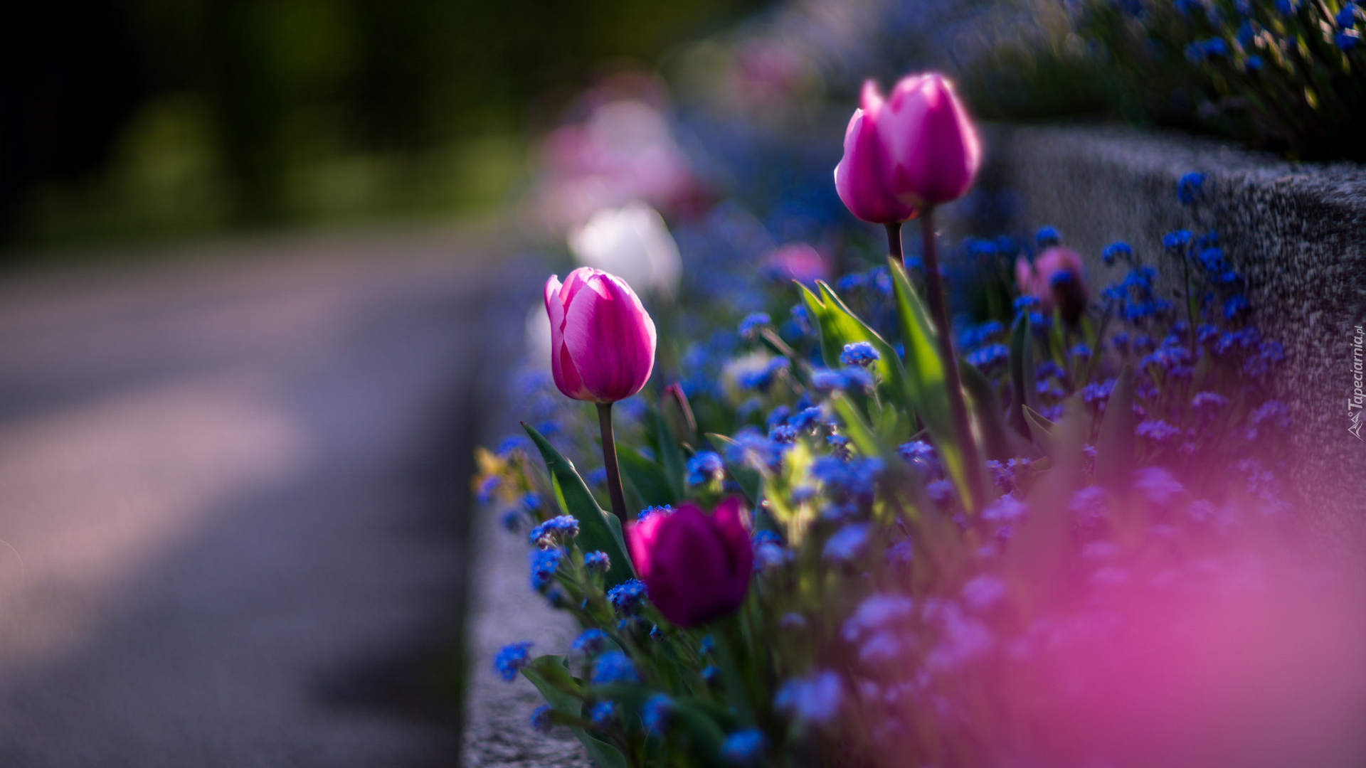 Edytor tapety: Rabatka, Tulipany, Niezapominajki, Rozmyte, Tło, Makro
