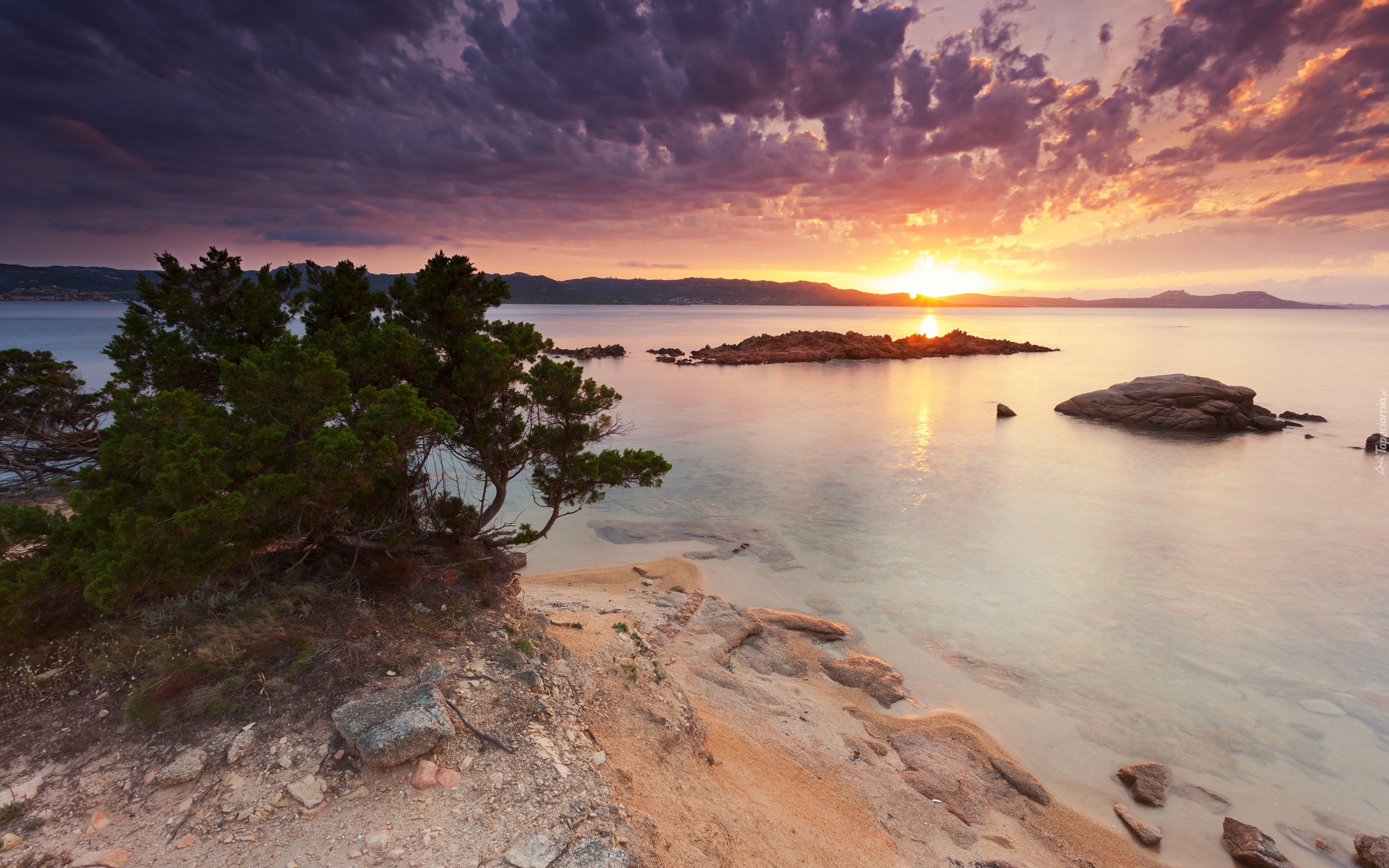Edytor tapety: Morze, Zachód słońca, Niebo,Kamienie, Chmury, Drzewa