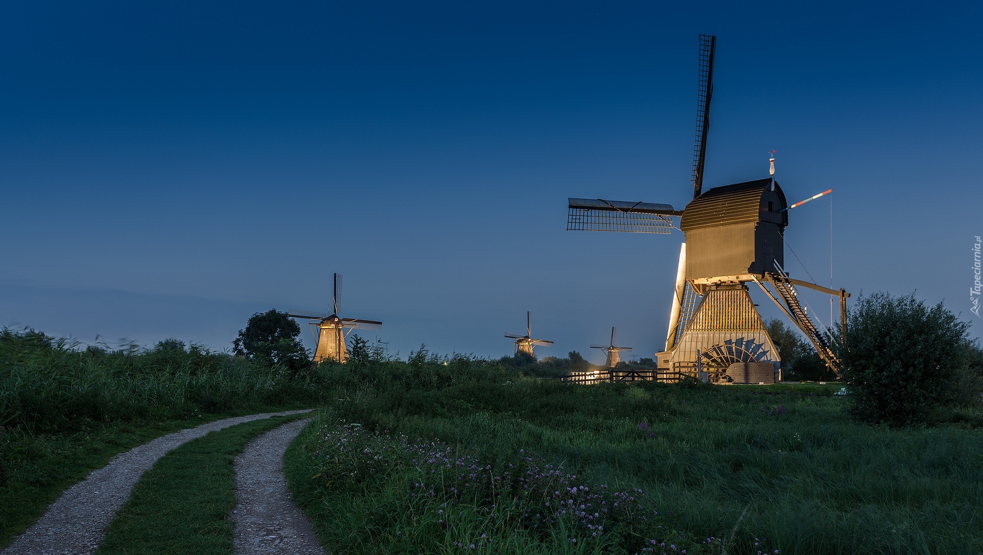 Edytor tapety: Wiejska, Droga, Wiatraki, Zmierzch