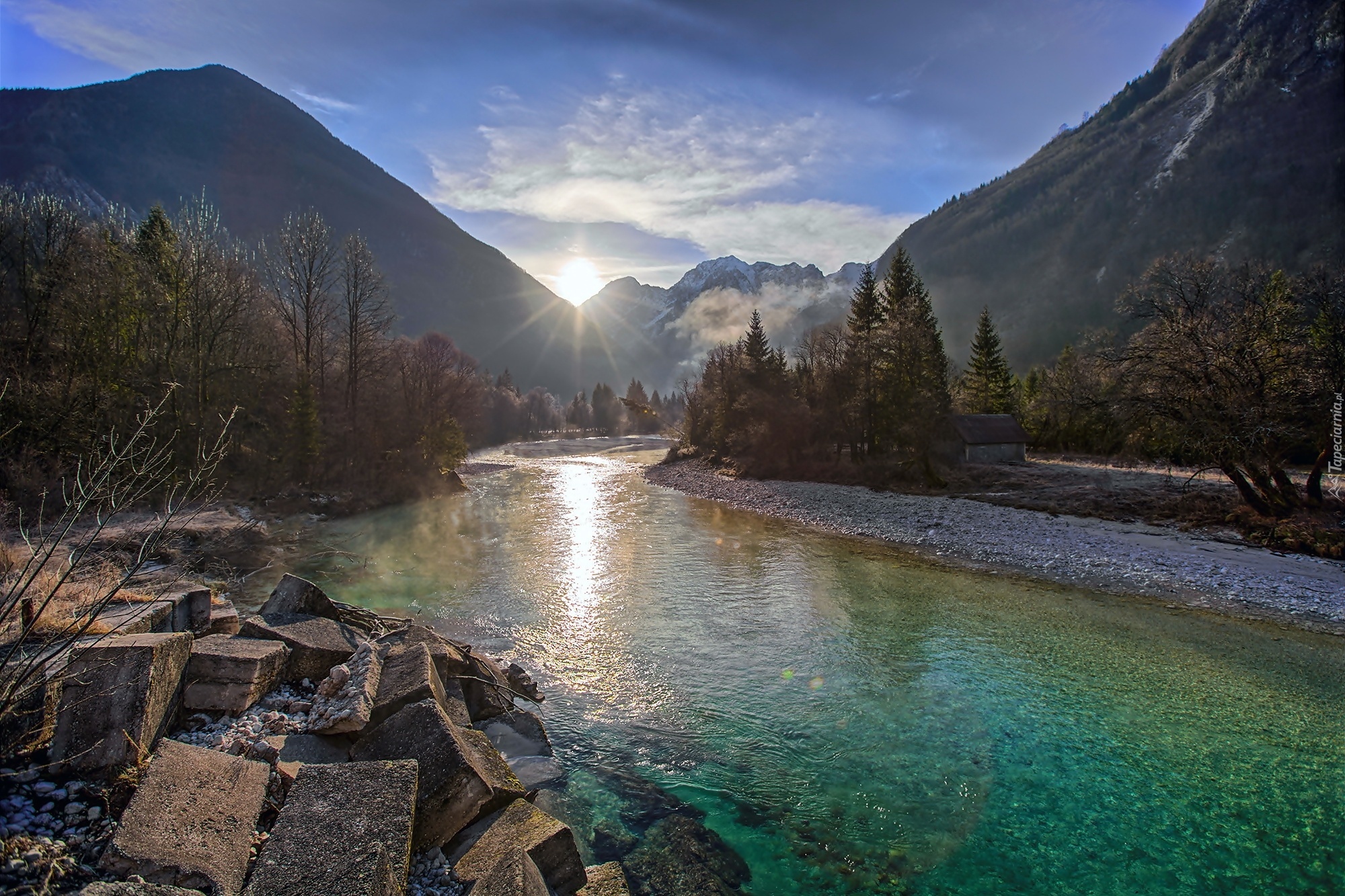 Edytor tapety: Góry, Las, Rzeka, Kamienie, Promienie Słońca, Słowenia