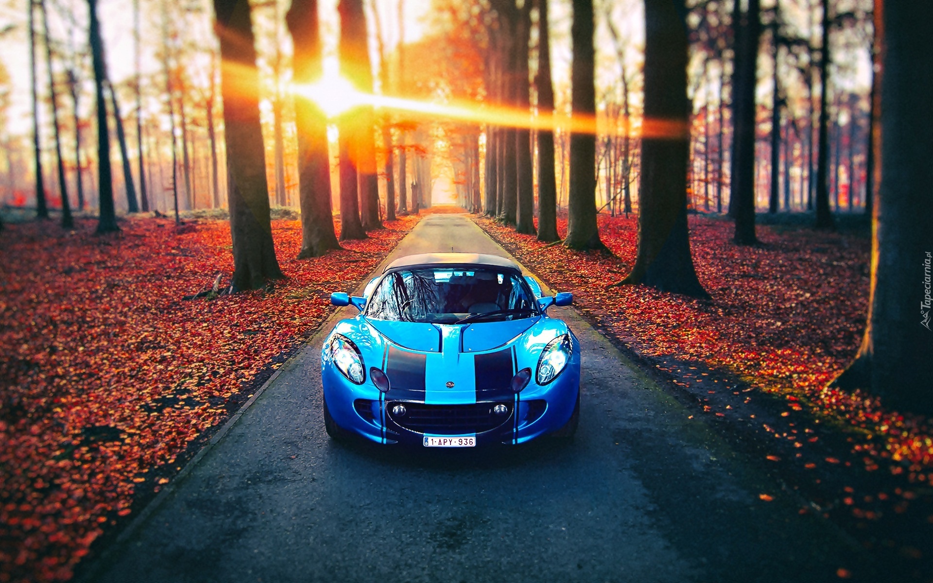 Edytor tapety: Samochód, Lotus, Jesień, Drzewa, Droga, Zachód, Słońca, Liście