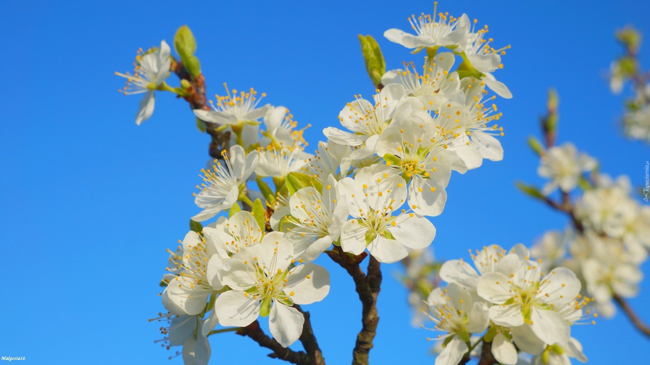 Edytor tapety: Białe, Kwiaty, Gałązka, Drzewo, Owocowe, Niebieskie, Niebo