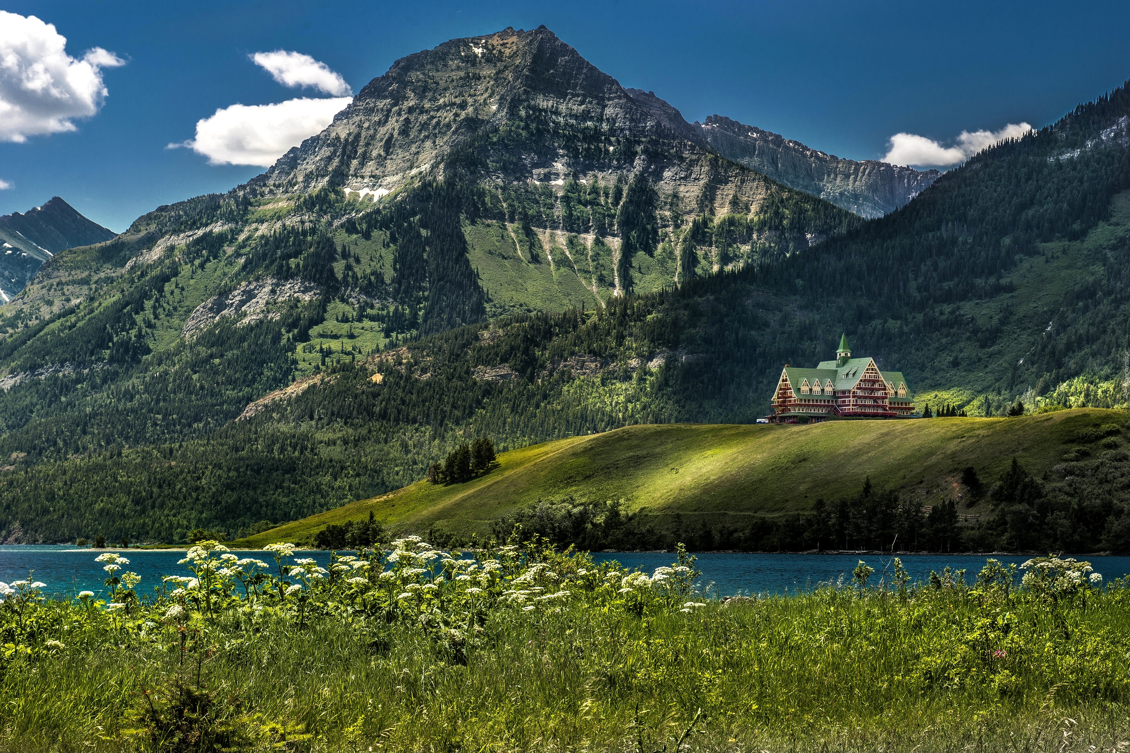 Edytor tapety: Góry, Rzeka, Łąka, Kwiaty, Dom