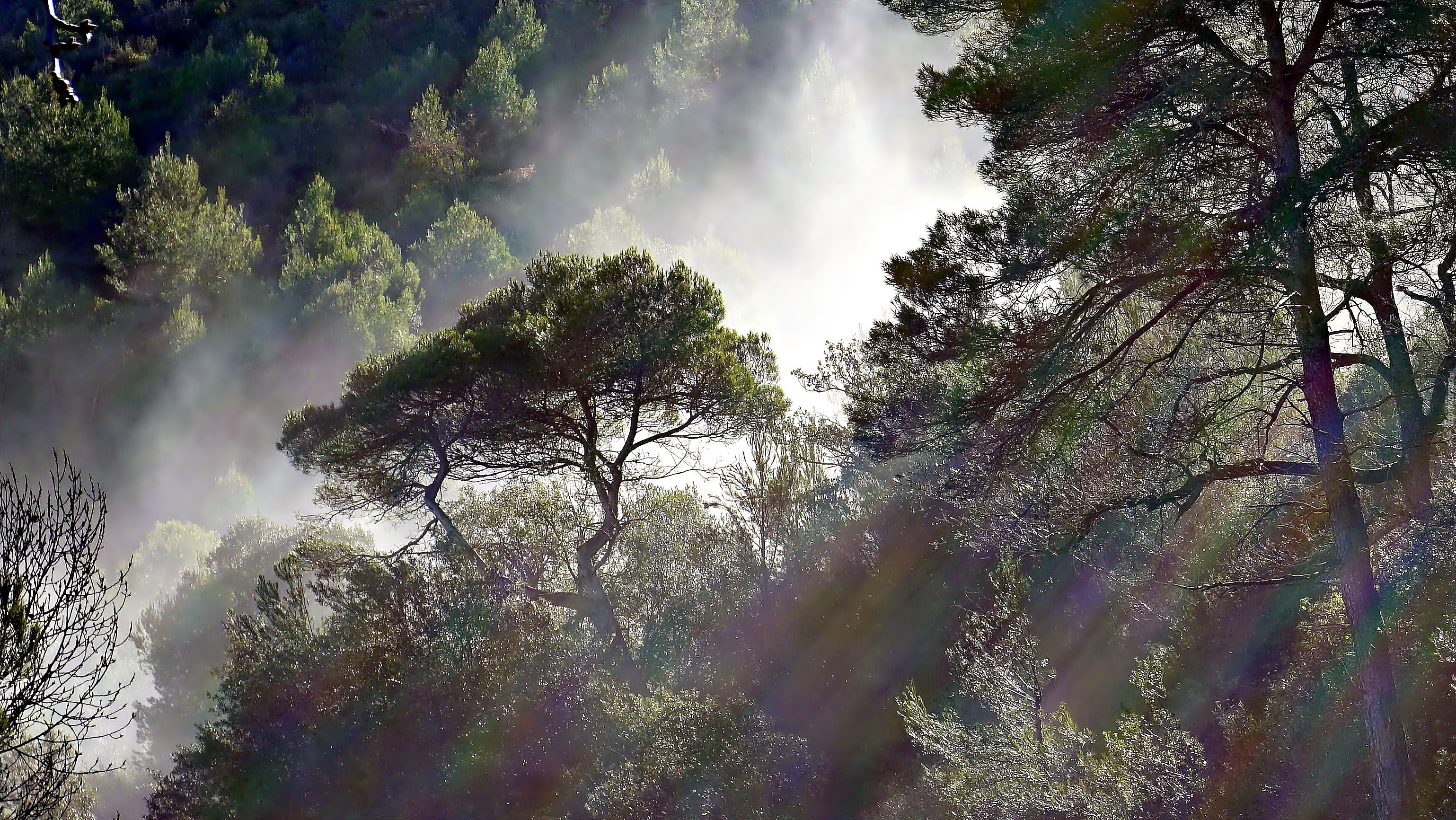Edytor tapety: Las, Mgła, Poranek, Przebijające Światło