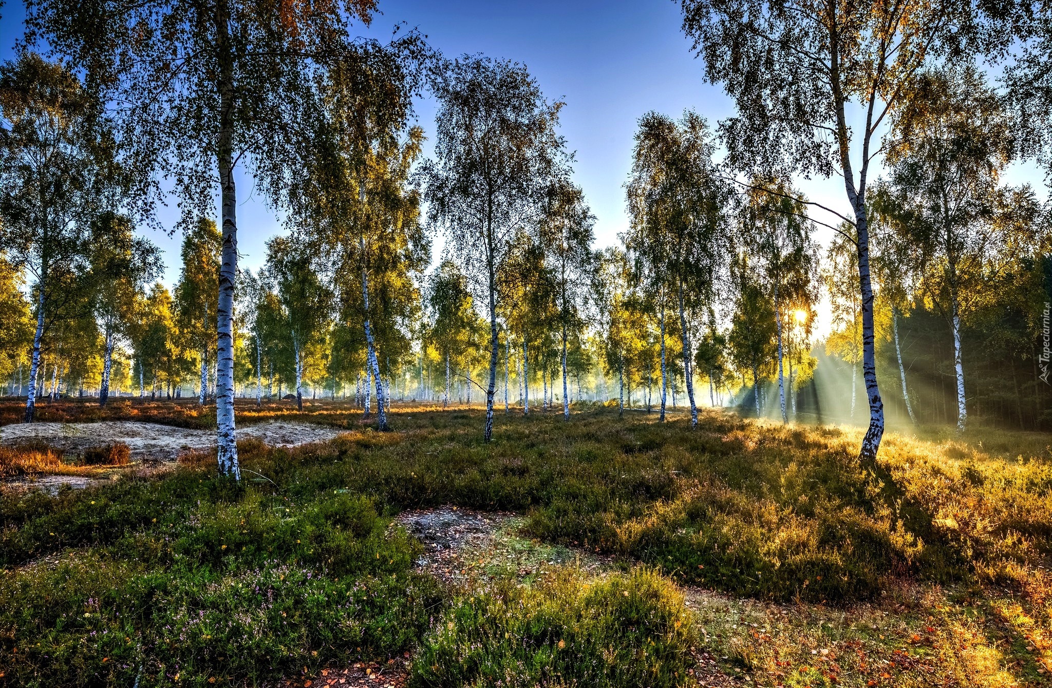 Edytor tapety: Brzozowy Zagajnik, Poranek, Przebijające Światło