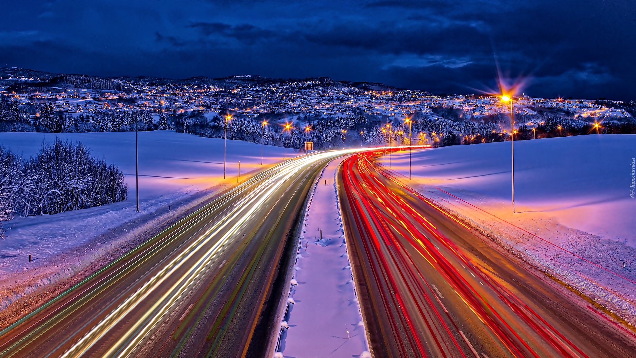 Edytor tapety: Zima, Droga, Panorama, Trondheim, Nocą, Norwegia