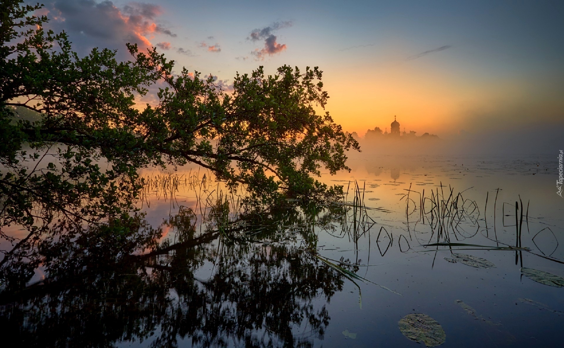 Edytor tapety: Drzewa, Jezioro, Kościół, Wschód, Słońca, Mgła