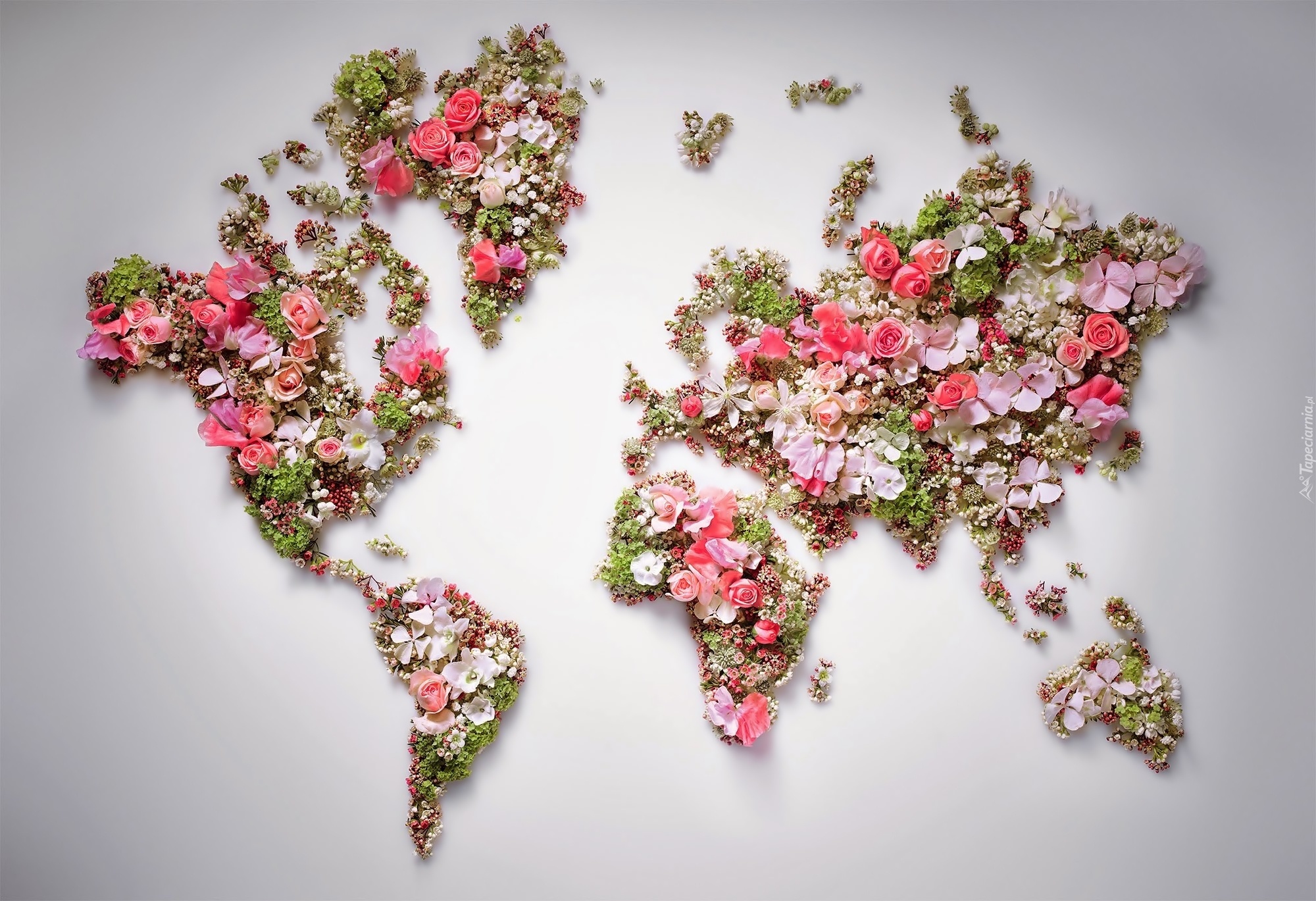 Edytor tapety: Kompozycja, Kolorowe, Kwiaty, Mapa Świata