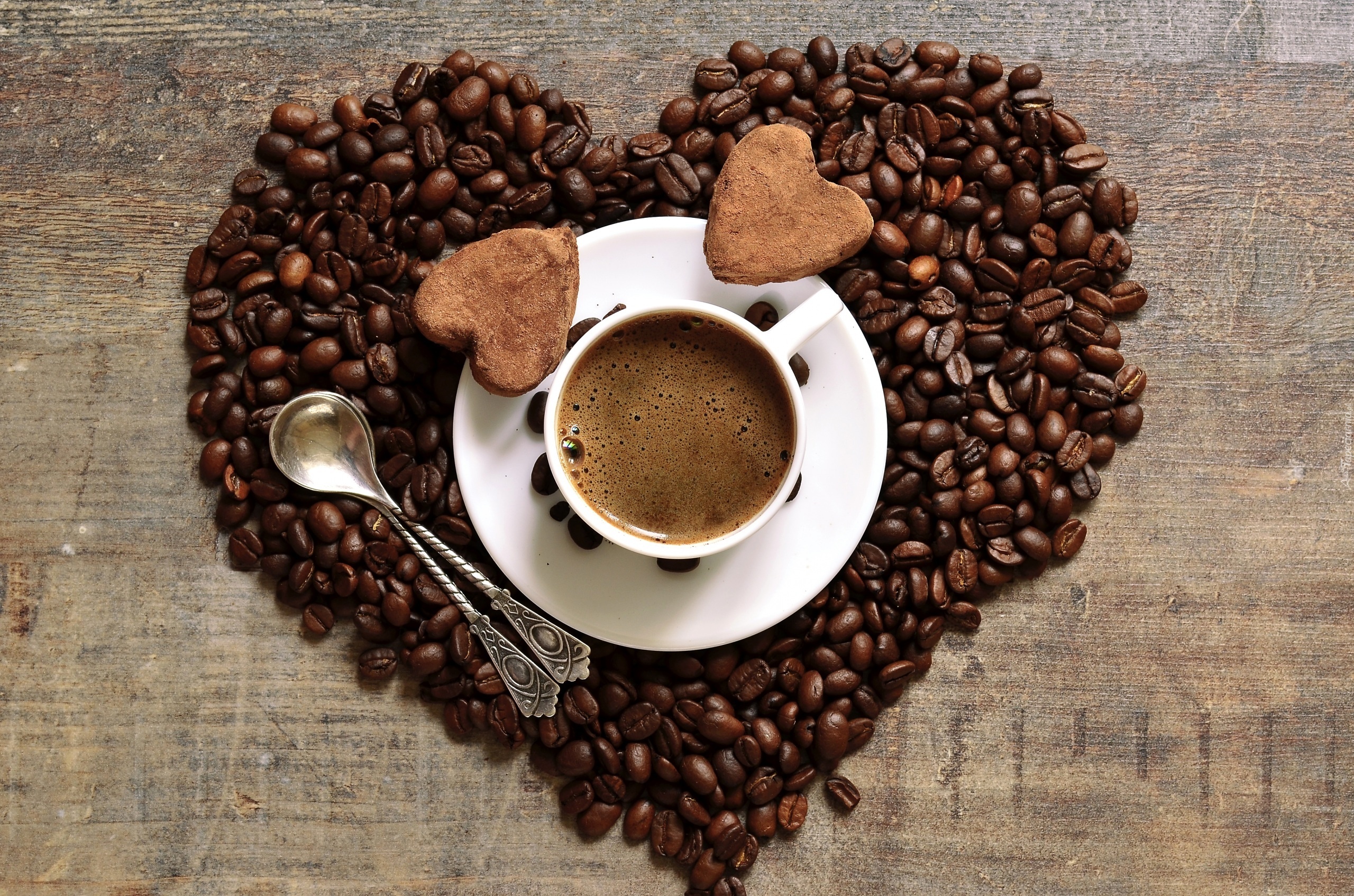 Edytor tapety: Kawa, Filiżanka, Ziarna, Serce, Ciastka, Łyżeczki