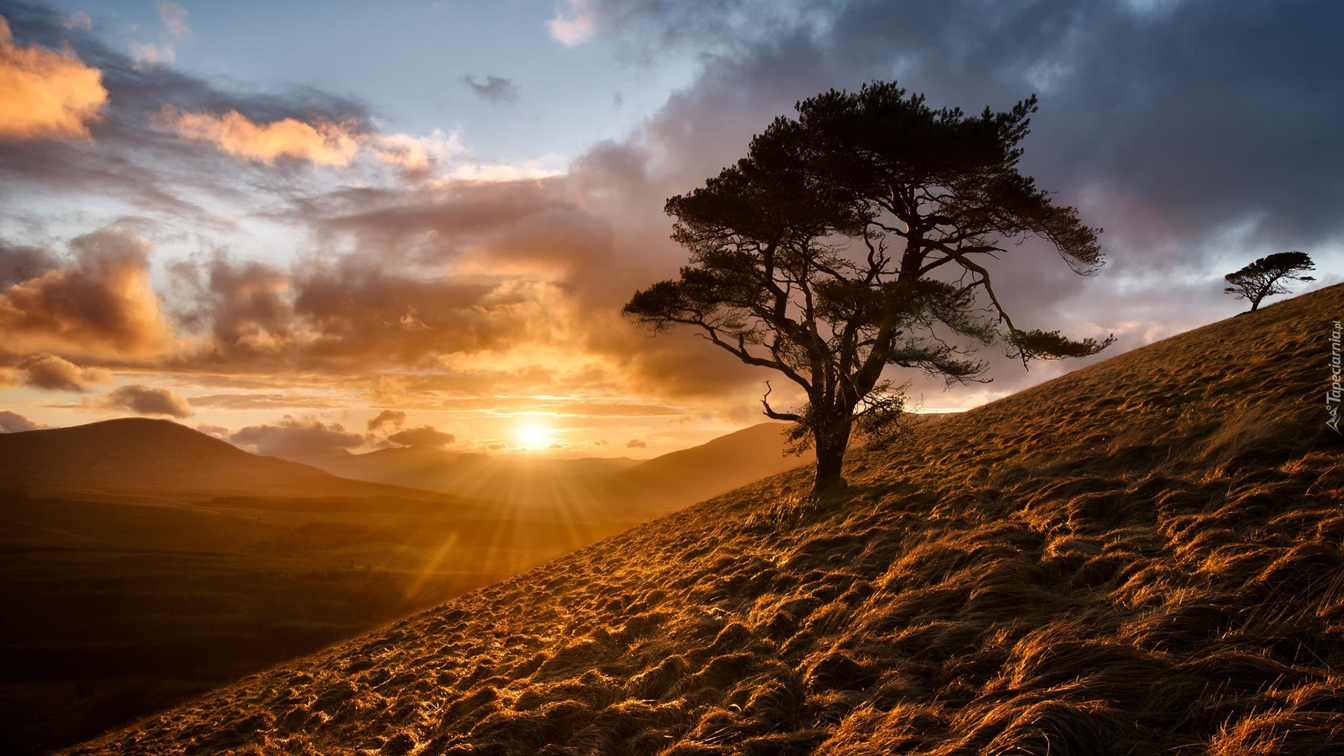 Edytor tapety: Góry, Zachód słońca, Chmury, Niebo, Drzewo
