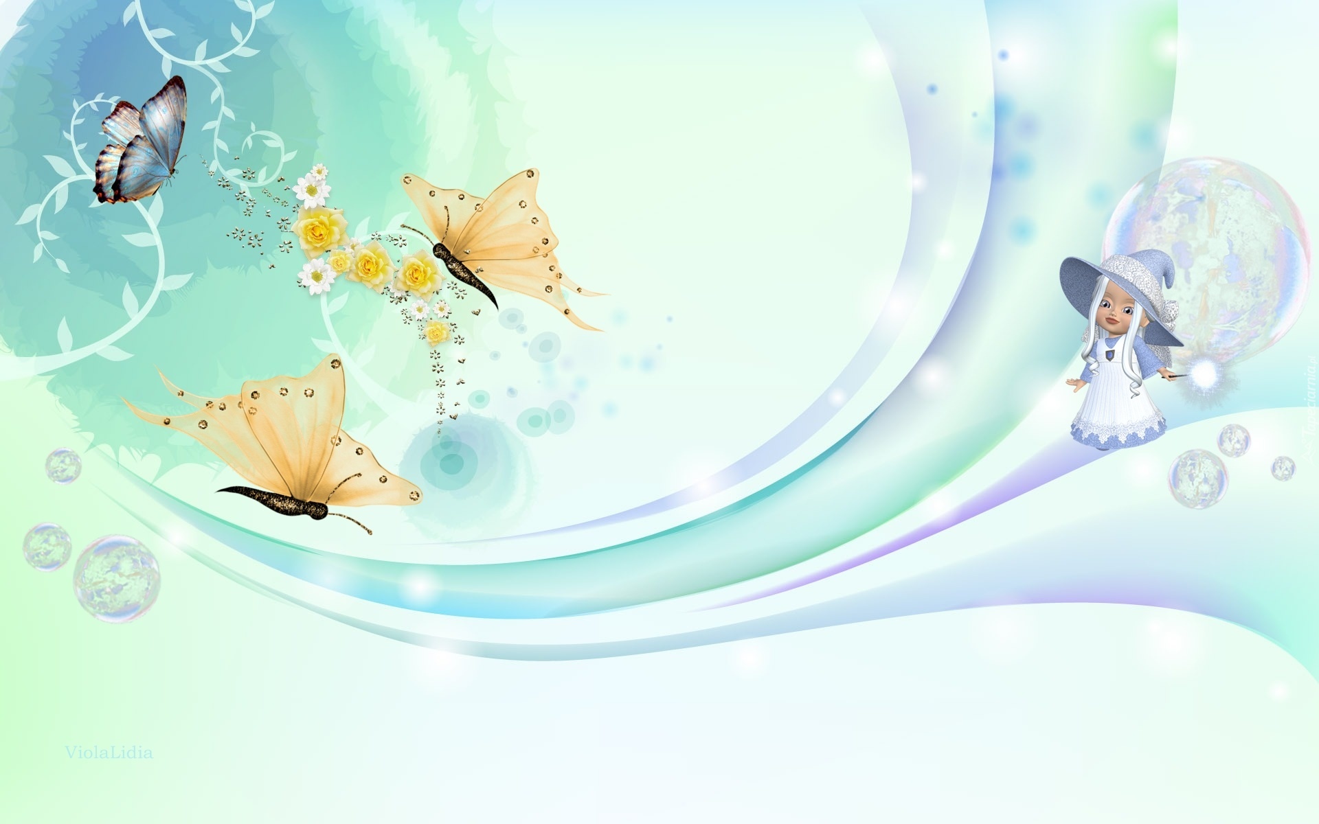 Edytor tapety: Grafika, Laleczka, Motyle, Bańki
