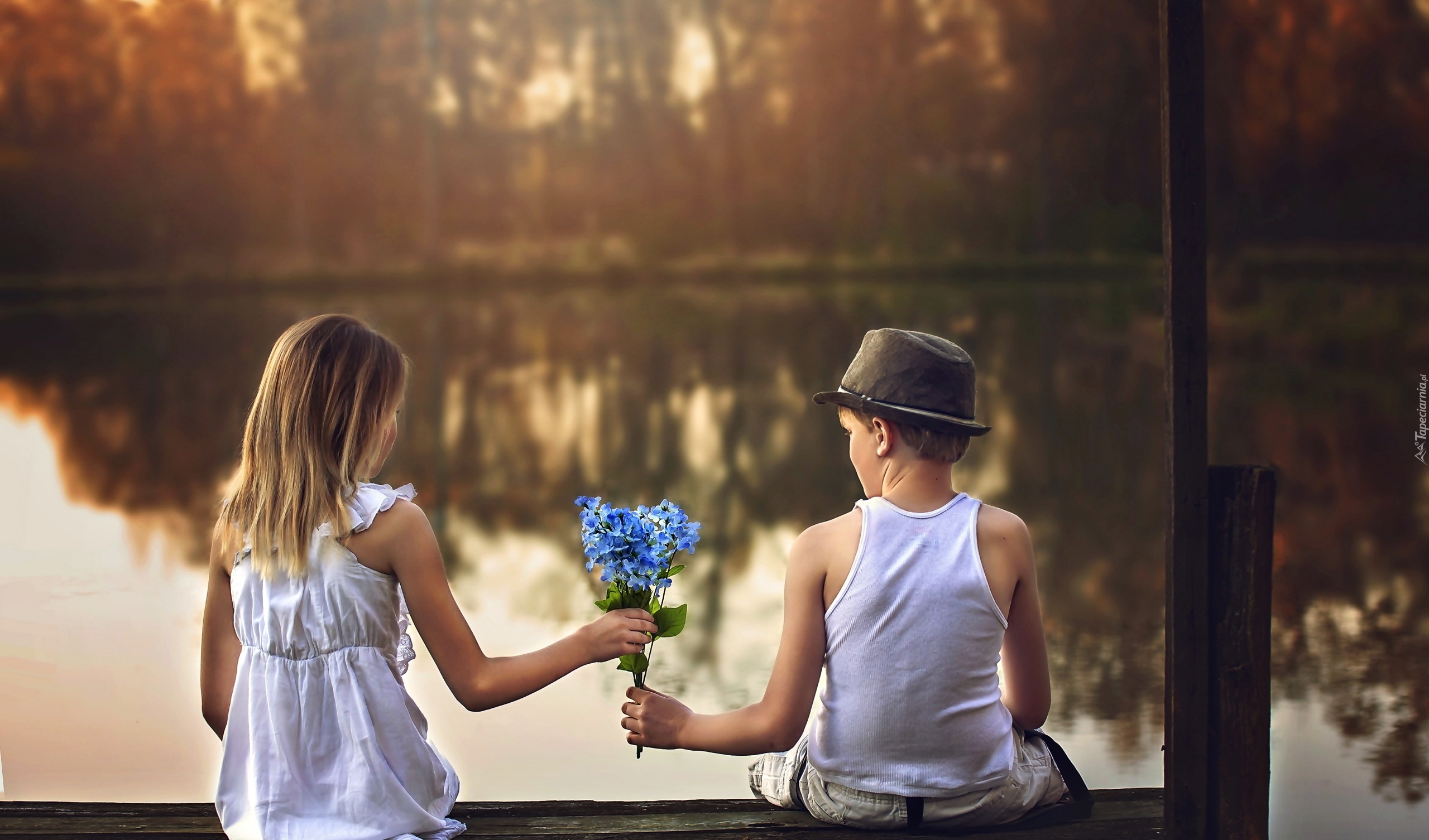 Edytor tapety: Dziewczyna, Chłopiec, Bukiet, Kwiatów, Niezapominajki, Przystań, Jezioro