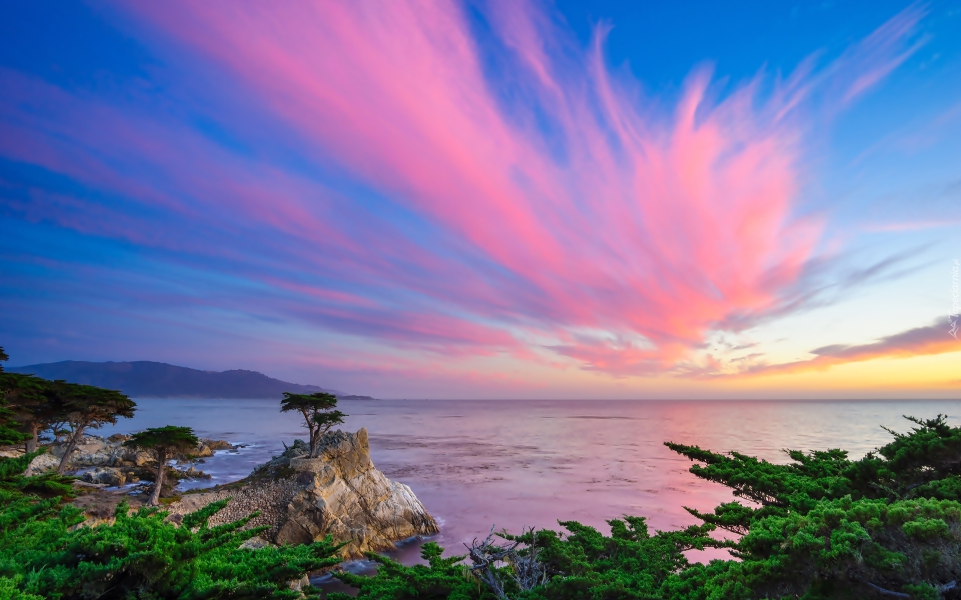 Edytor tapety: Samotny, Cyprys, Skała, Wybrzeże, Kalifornii, Zachód, Słońca