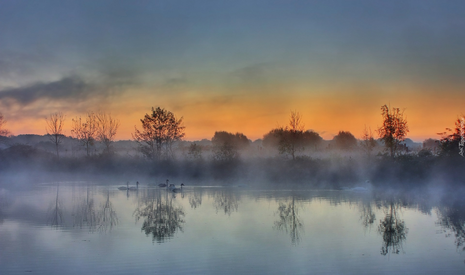 Edytor tapety: Mgła, Rzeka, Odbicie, Drzewa, Łabędzie, Niebo, Chmury