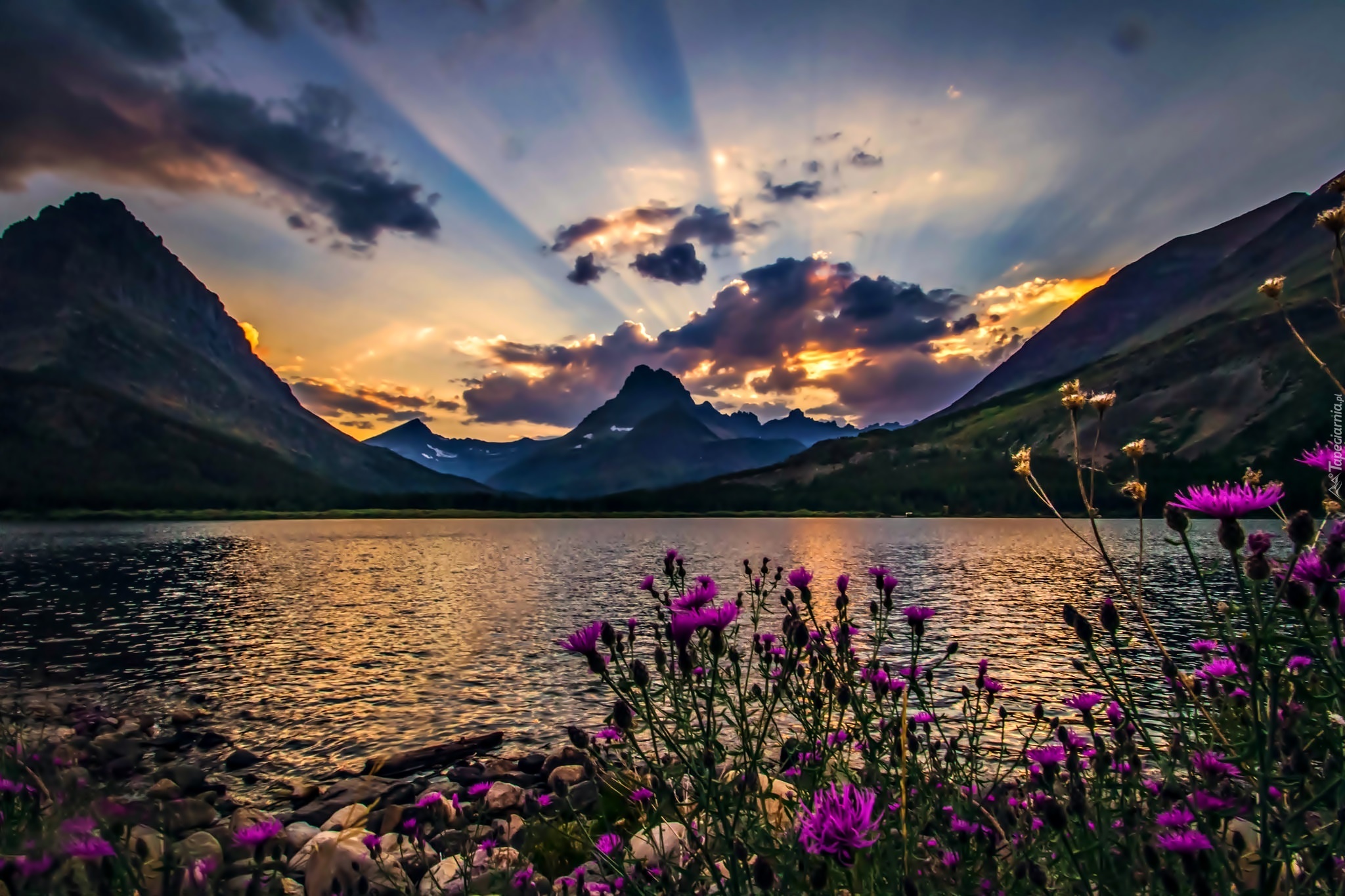 Edytor tapety: Góry, Jezioro, Chmury, Promienie, Słońca