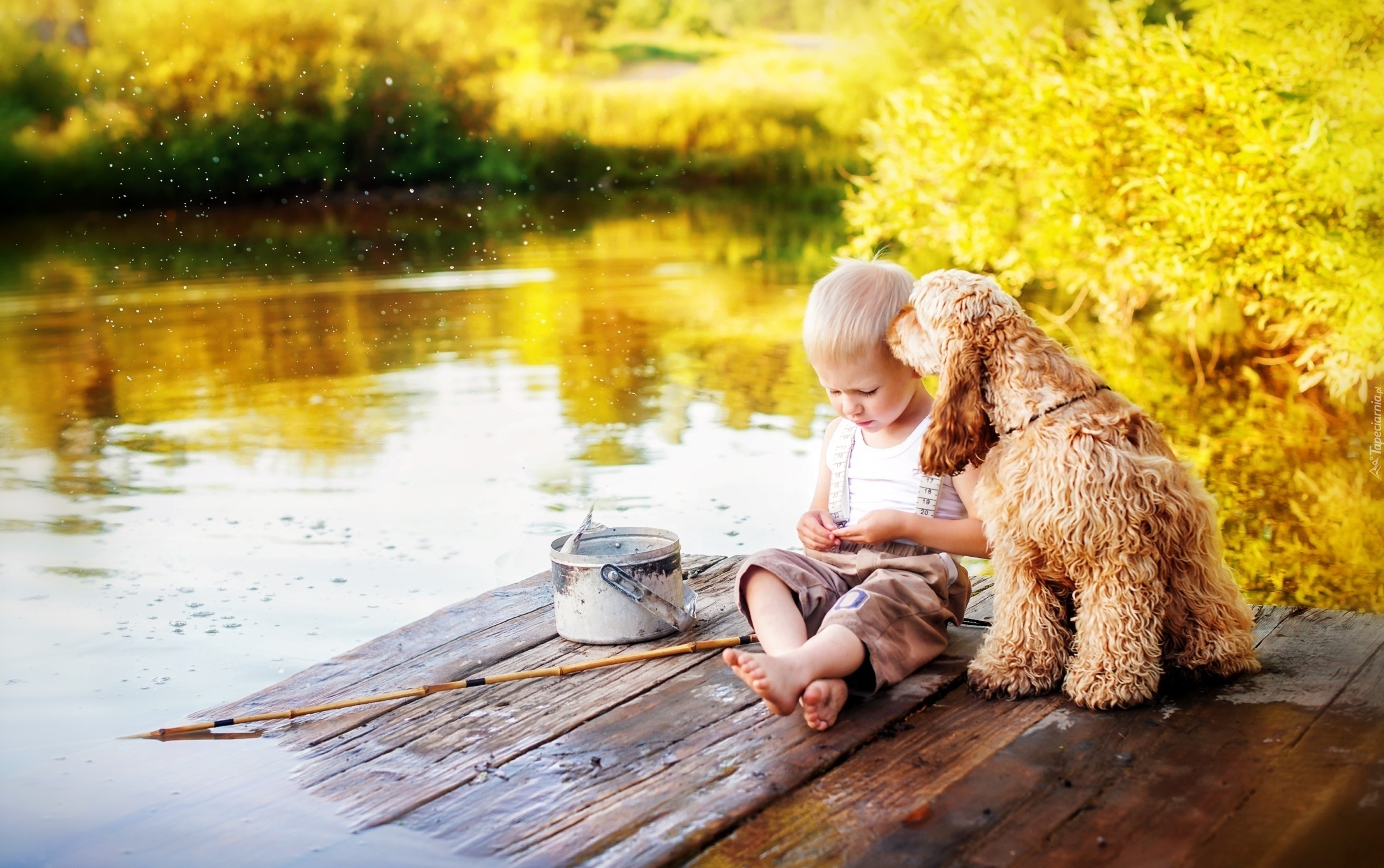 Edytor tapety: Chłopiec, Pies, Łowienie, Ryb, Wędka Rzeka, Drzewa