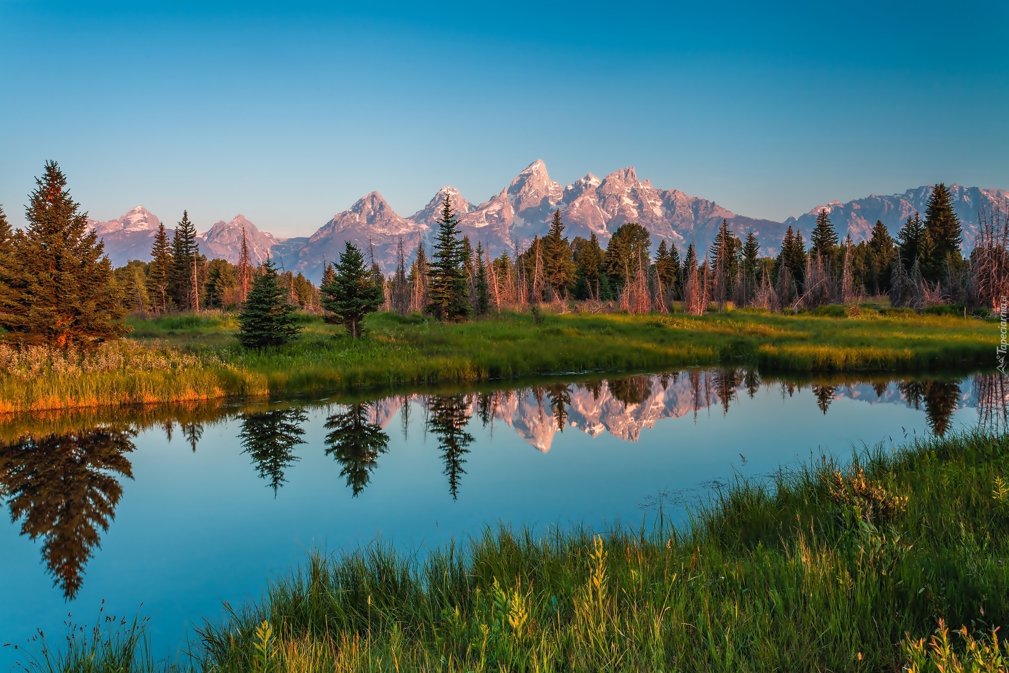 Edytor tapety: Góry, Las, Rzeka, Świt