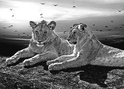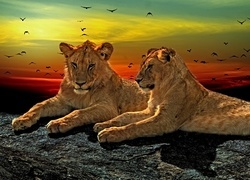 Edytor tapety: Lwy, Skała, Zachód Słońca, Ptaki