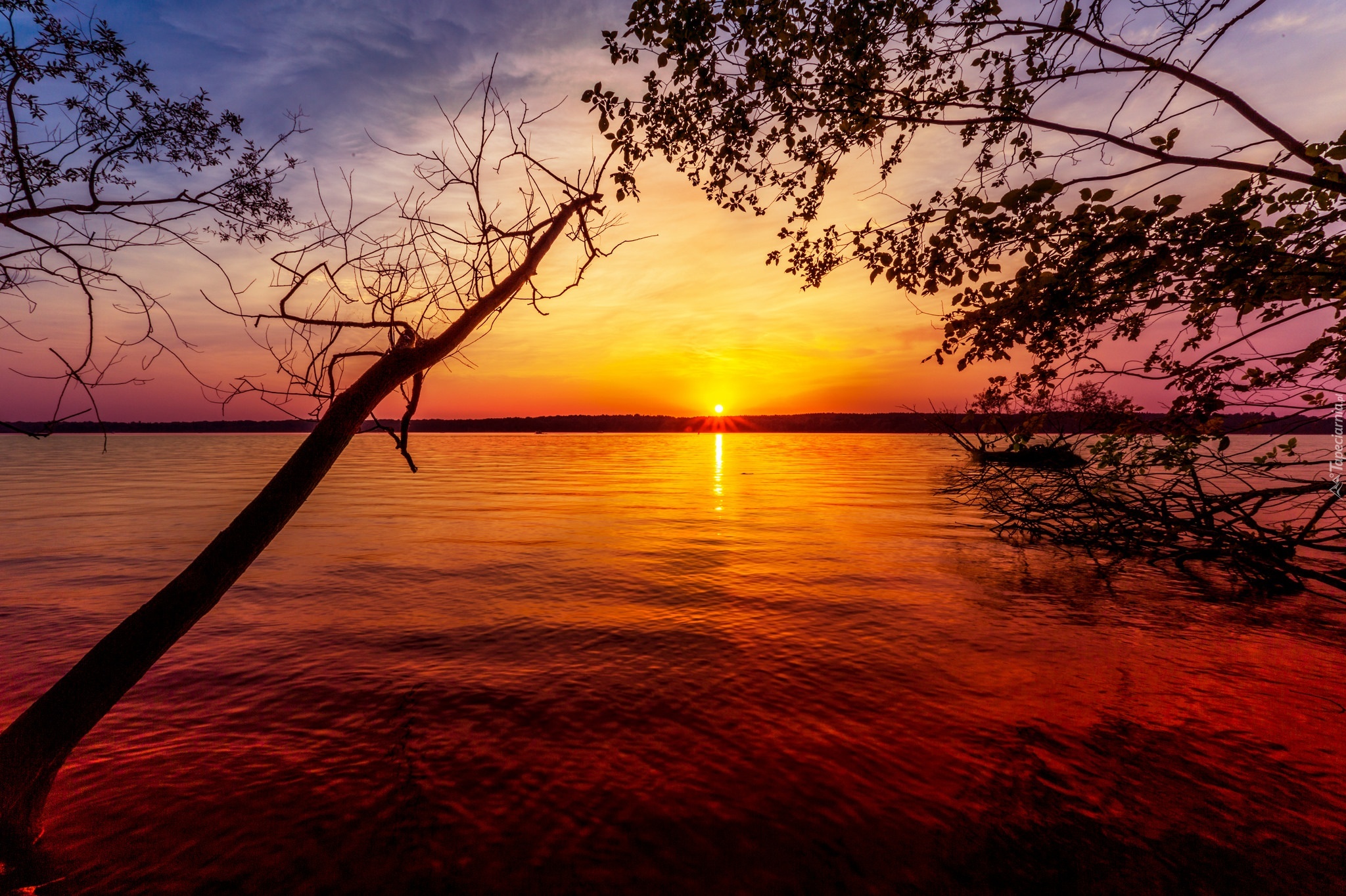 Edytor tapety: Jezioro, Zachód słońca, Gałęzie